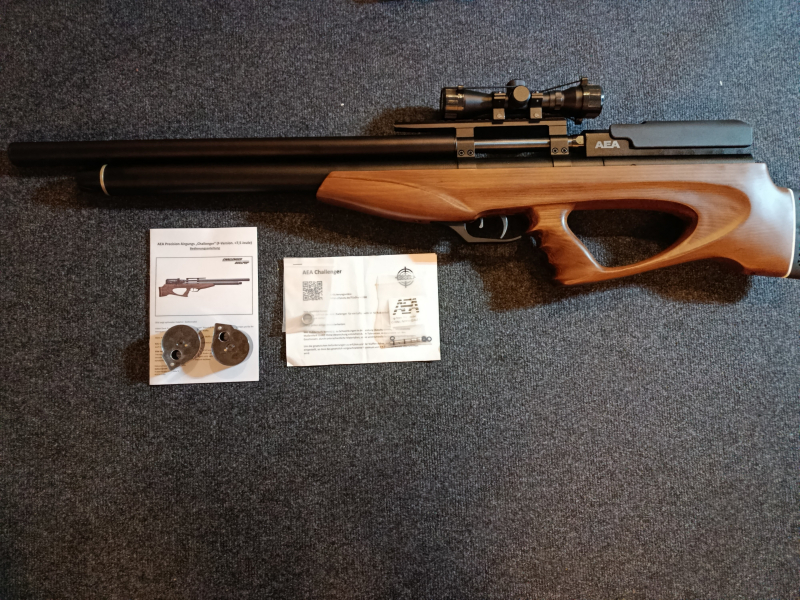 Zum Verkauf steht eine AEA Challenger im Kaliber 50 ( in der 7,5 Joule variante mit zwei magazinen gummigeschosse Getestet und voll funktionsfähig steht bei versand auf ca 90 bar druck) 2 Magazinen und Exportkit adapter und beschreibung sowie ein einfaches zielfernrohr 4-32. Gewehr wird im original karton versand.
