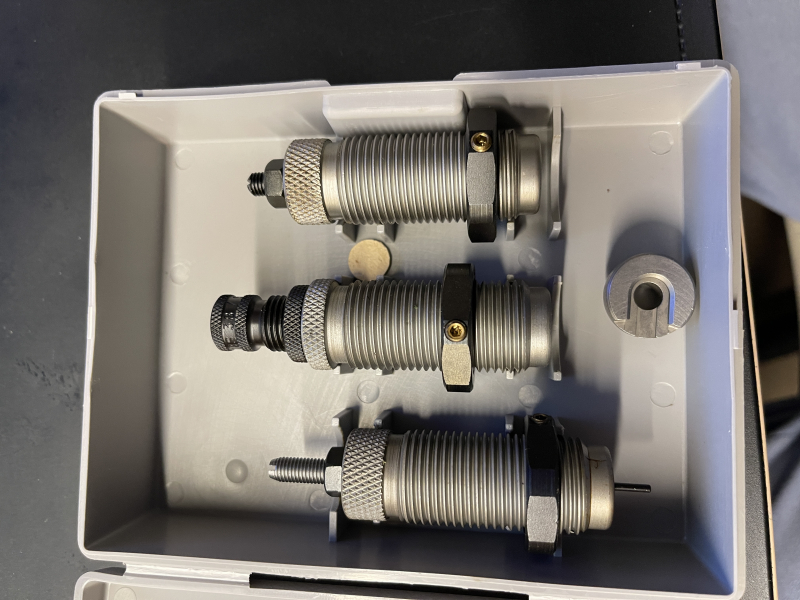 Die Karbide-Kalibriermatrize kalibriert die Hülse und entfernt die Zündhütchen (der Karbidkalibrierring eliminiert die Notwendigkeit der Schmierung). Die Expansionsmatrize erweitert die Hülse auf den richtigen Durchmesser für das Geschoss und verleiht dem Hülsenmund eine Aufweitung/Flare zur Geschosszuführung. Die Setzmatrize setzt das Geschoss und crimpt den Hülsenmund
