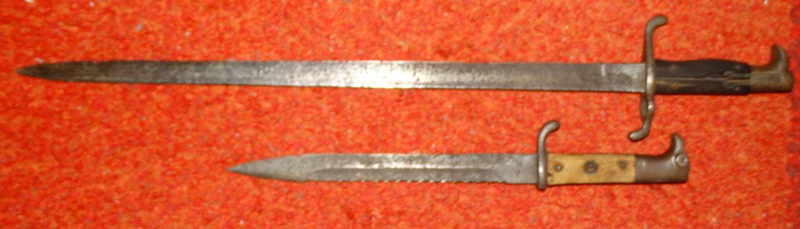 2 Bajonette - Jäger Mod. 65/71 (?), Hirschfänger, Eigentumsstück, Stück mit Rostnarben, Griffschalen mit durchgehendem Riß, Drückerfeder fehlt.