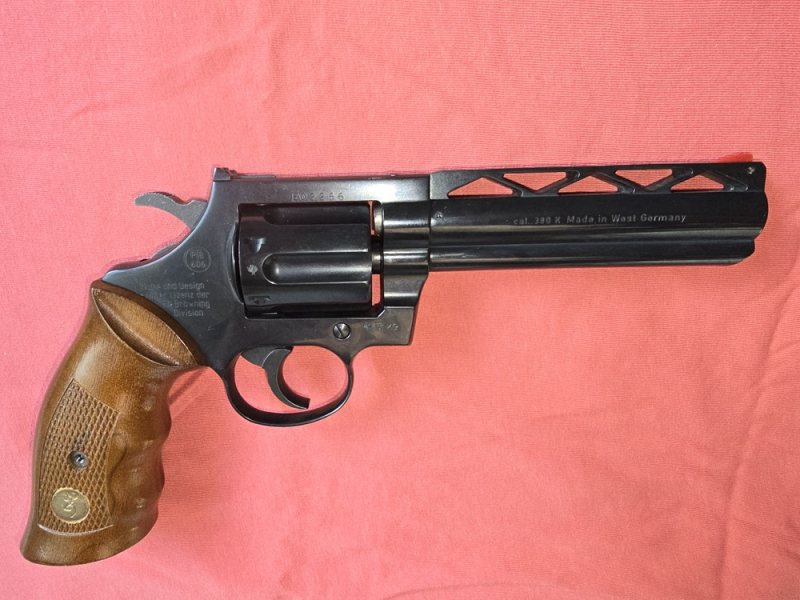 Schöner Revolver – Gasrevolver - Signalrevolver Fabrikat Browning. Modell BR 9. Kaliber .380 K. Mit PTB – Zeichen 606. Waffennummer: E02XXX. Name und Design unter Lizenz der Browning Division. 6 – schüssig. Lauflänge ca. 100 mm = 4“. Gewicht ca. 800 gramm. Brünierte Ausführung. Mit Holz – Griffschalen, Griffschalen mit Browning Plakette. Mechanische Funktionen einwandfrei. Waffe lässt sich leicht spannen und abschlagen. Der Lieferumfang beinhaltet: die Waffe und einen Kunststoff – Kurzwaffenkoffer mit Schaumstoffnoppen – Einlage.