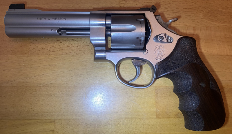 Smith & Wesson 625-4 (Modelvariante mit buntgehärteten Abzug und Hammer), Kaliber .45ACP, 5“ Lauf, Überarbeitung von Otto Spatz-Kleinostheim (Abzug, Timing, Trommelspalt 0,07mm), Lauf blitzblank, super Zustand, 19 Stück Full Moon Clips, original Rechnungen.