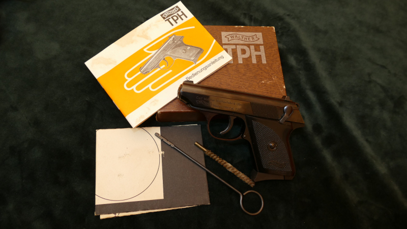 Walther Mod. TPH, Kal. .22lr, Erhaltungszustand hervorragend (offensichtlich sehr wenig bis gar nicht geschossen), Lauf selbstverständlich blank. Beschuß 1971. Mit original Verpackung, Bedienungsanleitung, Schußbild und Putzstock.