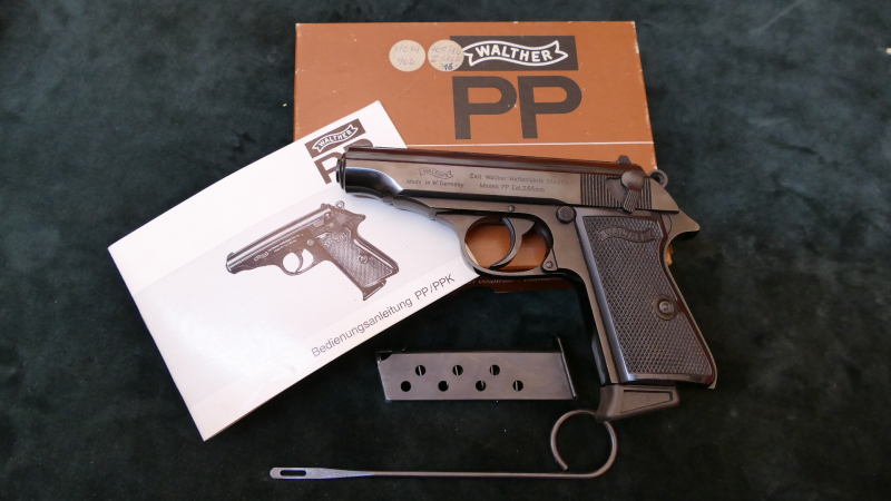 Walther Mod. PP, Kal. 7,65mmBr., Erhaltungszustand hervorragend (offensichtlich sehr wenig geschossen, ein paar kleine Kratzer auf dem Lauf/Patronenlager im Auswurffenster), Lauf selbstverständlich blank. Beschuß 1971. Mit original Verpackung, Bedienungsanleitung, 2. Magazin und Putzstock.