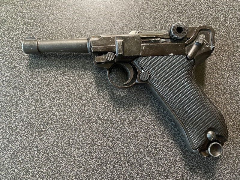Zum Verkauf steht eine Modellpistole 08. Druckguß und Kunststoff,Deko, nicht schußfähig. Kniegelenk läßt sich spannen, Magazin läßt sich entnehmen. Abzug läßt sich bewegen und Seitenplatte entfernen. Beim Durchladen bleibt jedoch die Schlagfeder nicht gespannt. Habe auch keine Ursachenforschung betrieben. Bei Versand ins Ausland bitte Portokosten erfragen, keine Garantie oder Rücknahme.