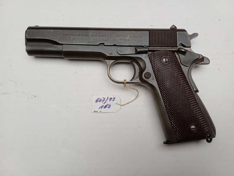 Auf der linken Schlittenseite sind die Patentangaben von 1897, 1902 und 1913 und der Hersteller Colt mit Logo noch erkenntlich eingraviert. Fremdstempel von Waffenimportfirmen sind ebenfalls vorhanden. Der Schlitten ist auf der linken Seite etwas stärker abgegriffen. Ansonsten macht die Pistole für die lange Dienstzeit einen sehr guten Eindruck. Mit dieser Pistole wurde zweimal ein VDW-Schießen mit originalen Waffen gewonnen.