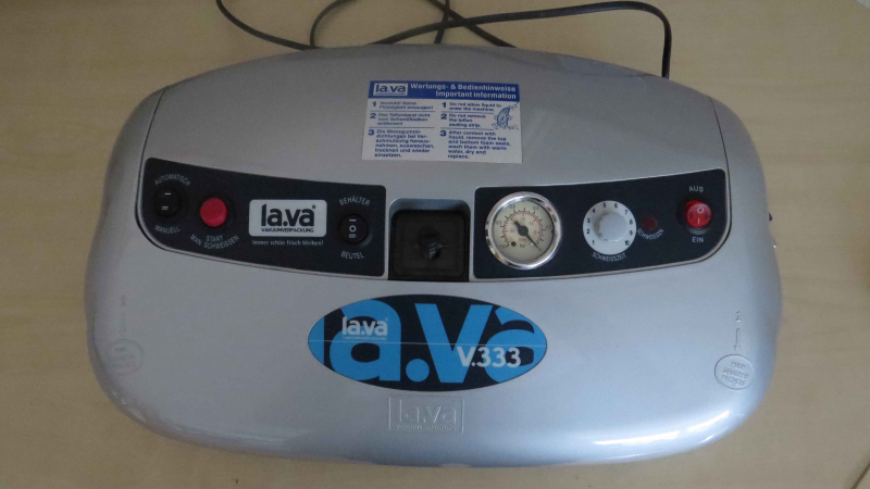 Zum Verkauf steht ein la.va V.333 Vakuumiergerät inkl. unzähligen Folien in unterschiedlichen Größen und weiterem Zubehör.