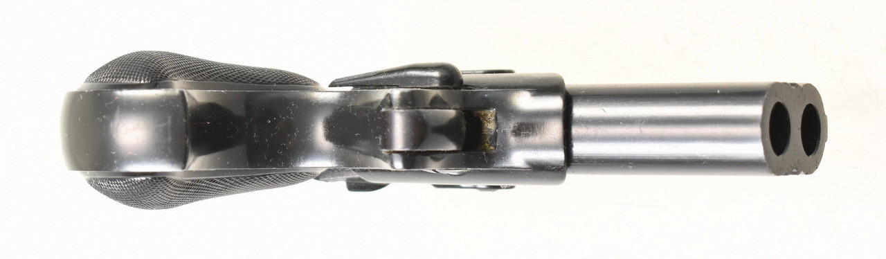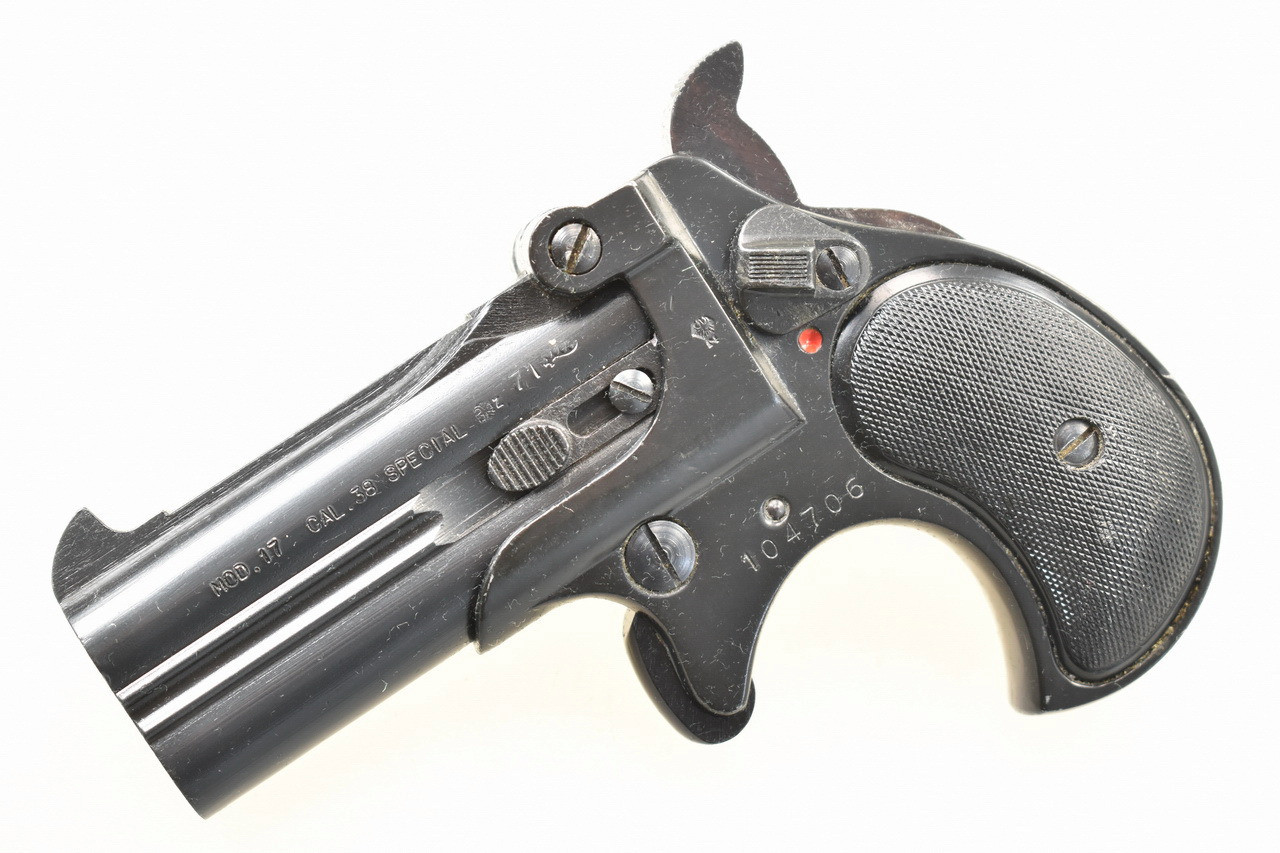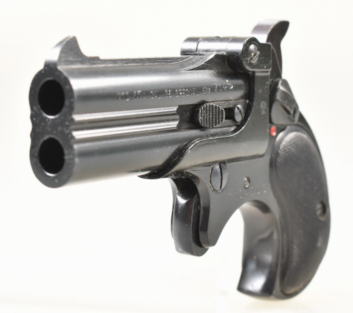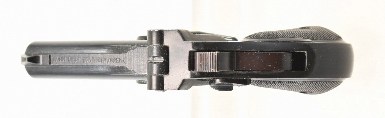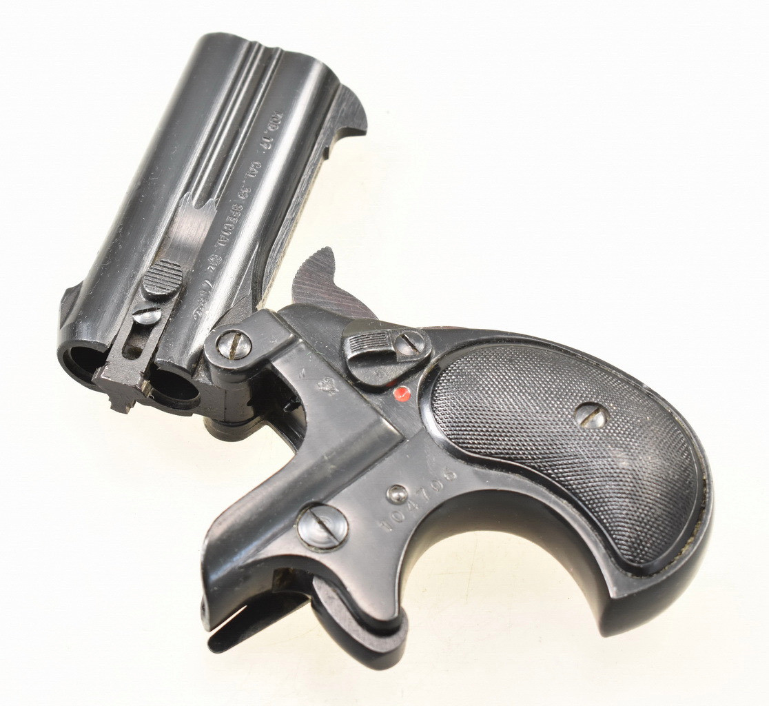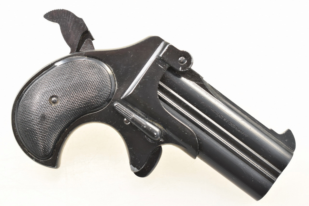 Zweischüssiger Derringer " Made in Germany " aus Produktion der RÖHM GmbH, Sontheim / Brenz. Spiegelblanke Läufe. Ulmer Beschuß 1971. Schwarze Kunststoffgriffschalen mit Fischhautmuster. Trage- und Gebrauchsspuren sind vorhanden. Details siehe Bilder.
