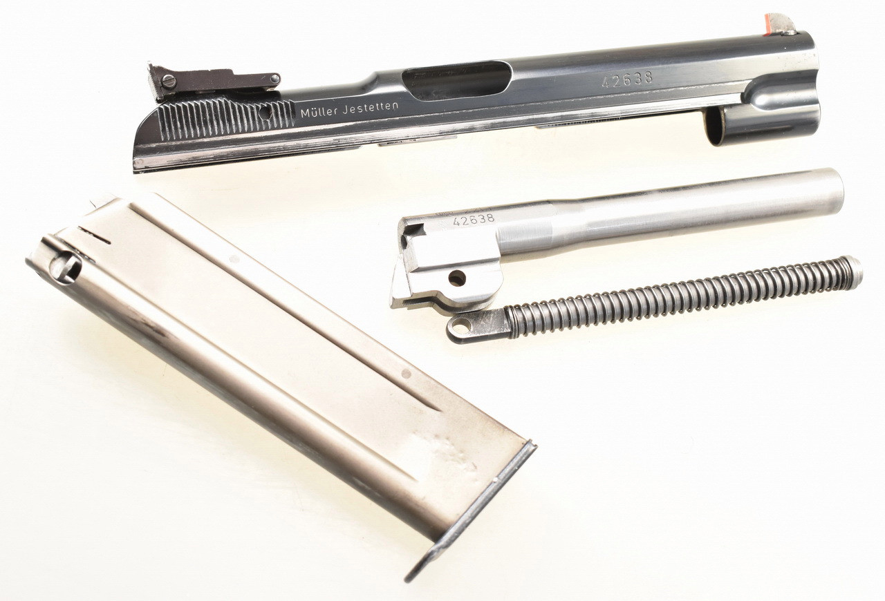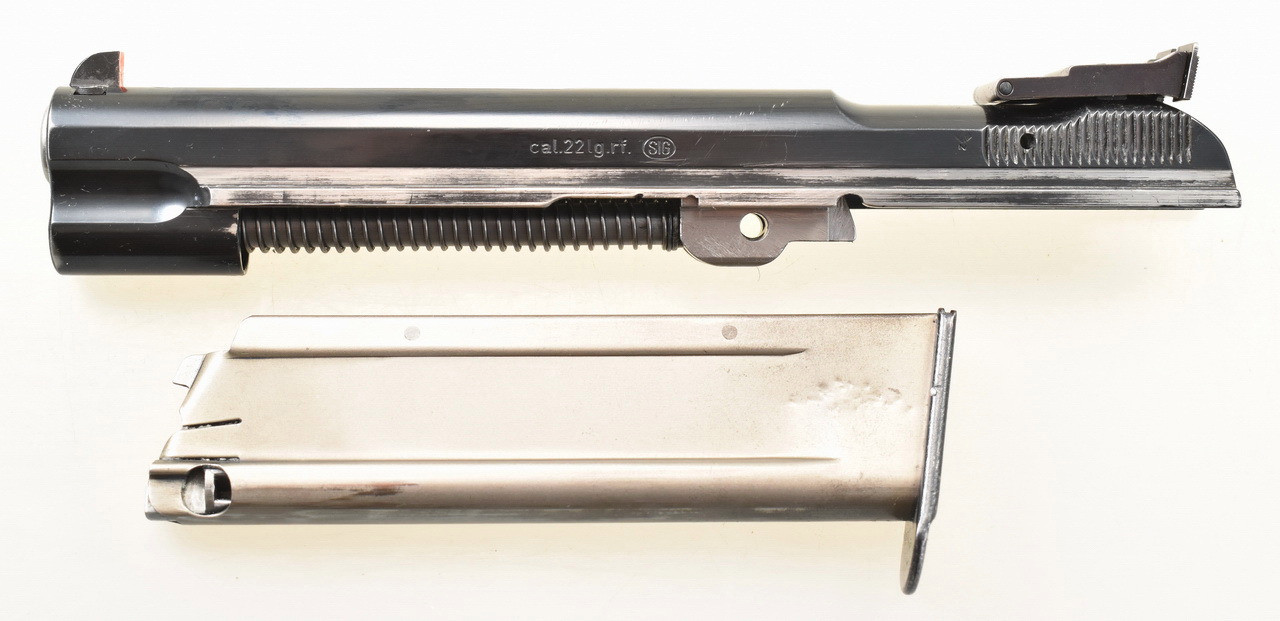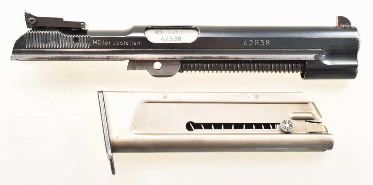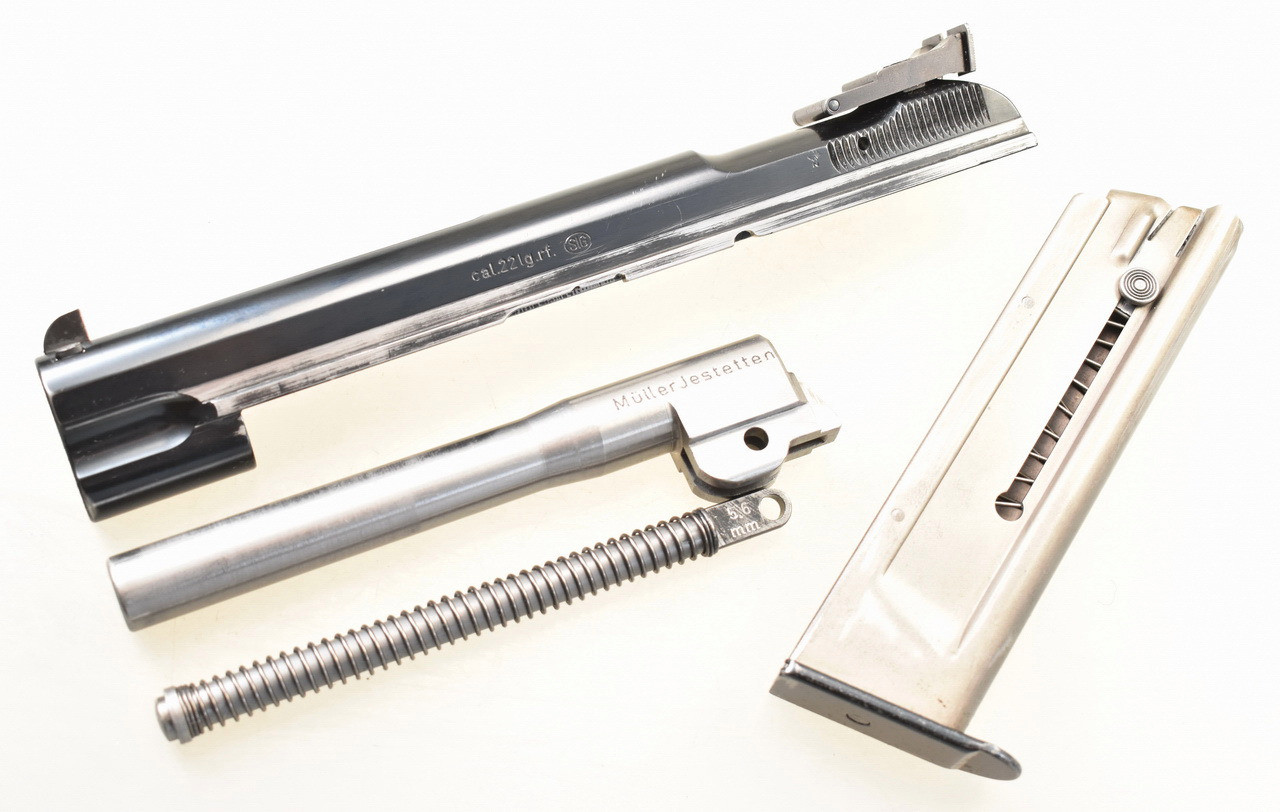 Spiegelblanker, 124mm langer Lauf. Bundesdeutscher Beschuß. Müller Jestetten Vertriebsstempel. Originale SIG Mikrometervisierung mit Balkenkorn und 174mm langer Visierlinie. 8 - Schuß Magazin. Gebrauchs- und Lagerungsspuren sind vorhanden. Details siehe Bilder.