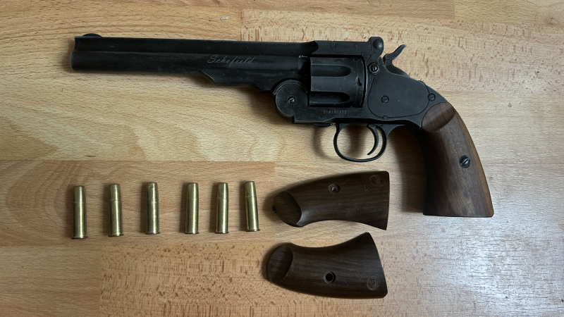 Der Revolver hat Soezialangefertigte Nussholz Griffschalen die perfekt passen . Die Plastik Griffe haben mich sehr gestört. Zusätzlich wurde ein komplett gezogener Lauf verbaut . Der Revolver hat von Werk an einen Glattlauf .