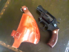 Angeboten wird ein sehr schön erhaltener ERMA EGR66 im Kaliber 9mm RK. Der Revolver ist eigentlich neuwertig. Ich spreche nur sicherheitshalber von leichten Gebrauchsspuren. Schlossgang perfekt. Ich weiß nicht, ob er geschossen wurde. Das Ausschwenken der Trommel geht (wie bei den meisten neuen Ermas) etwas stramm. Besonderheit für Sammler: Bei diesem Exemplar sind die Trommelflutungen etwas breiter als üblich. Erma hat einige Exemplare mit dieser Besonderheit sowohl stainless als auch brüniert gefertigt. Den Grund konnte ich nicht herausfinden, das wäre eine Frage an die ERMA-Experten. In jedem Fall eine interessante Rarität, die mich optisch etwas an die frühen Terrier-Revolver von S&W erinnert. Das Holster ist ein sehr schönes Schulterholster, allerdings ohne Beriemung. (Solche kann man leicht und günstig unter Holsterzubehör erstehen.) Sonst kein Zubehör.
