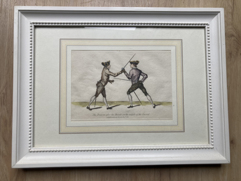 Ich biete hier eine gerahmte originale Seite des Fechtbuchs "School of Fencing" des berühmten Fechtmeisters Domenico Angelo an. Angelo war Begründer einer Dynastie von italienisch-französisch-stämmigen Fechtlehrern, die England Mitte des 18. bis ins 19. Jahrhundert hin eine große Rolle im zivilen und militärischen Fechten spielten. Bestzustand, Neupreis 90 Euro (ohne Rahmen). Da dies ein privater Verkauf ist, gewähre ich keine Garantie und kein Rückgaberecht (siehe EU-Recht). BEI SOFORTKAUF übernehme ich die Versandkosten (innerhalb Deutschlands).