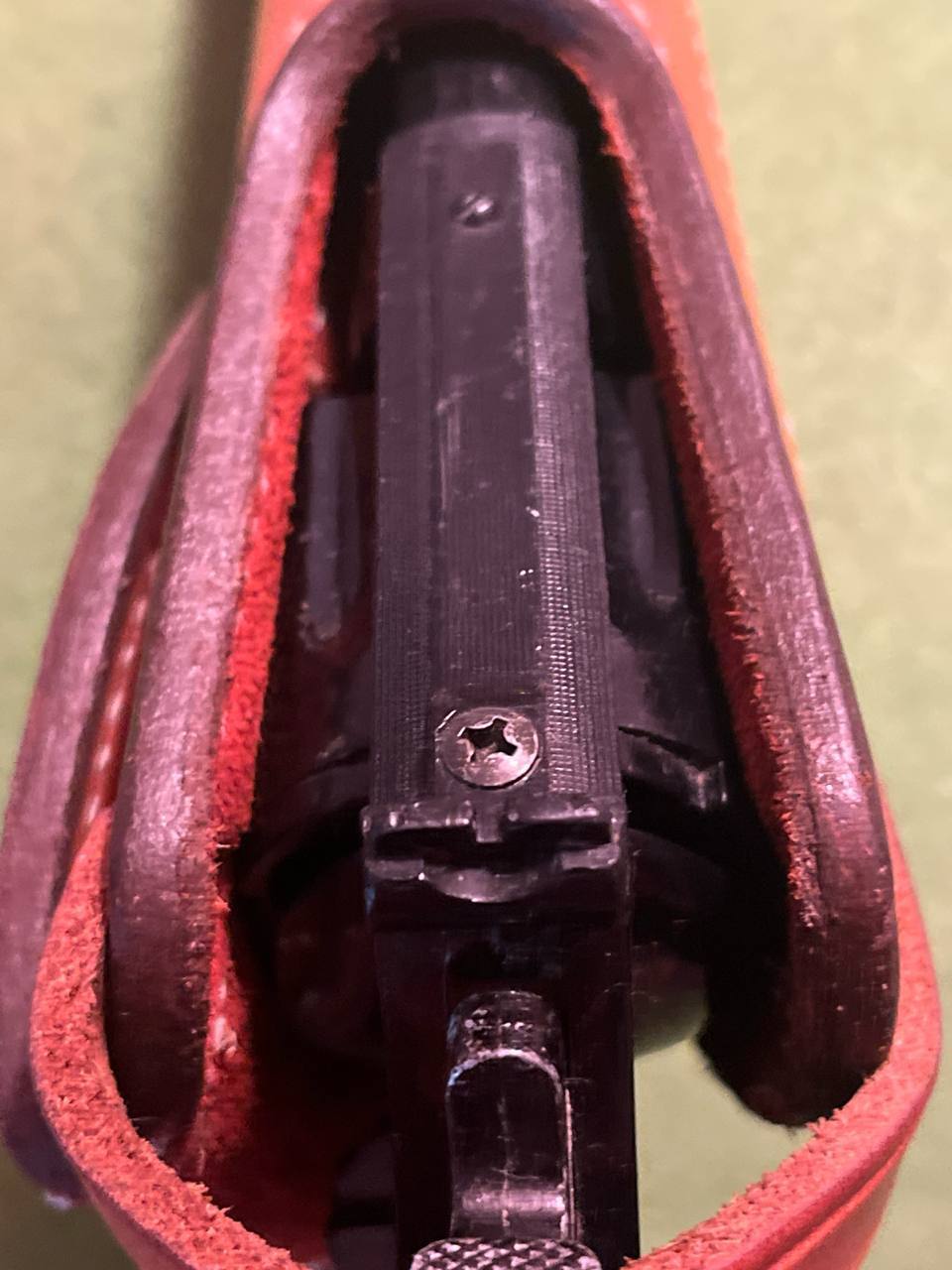 zu sehen, mit einer grosszügigen Aussparung für die Kimme von dem evtl. drinnensteckenden Sportrevolver. Das Ganze Teil ist innen waffenschonend mit hochwertigem Wildleder gefüttert, wie hier auf dem üblichen Bild der Rückseite