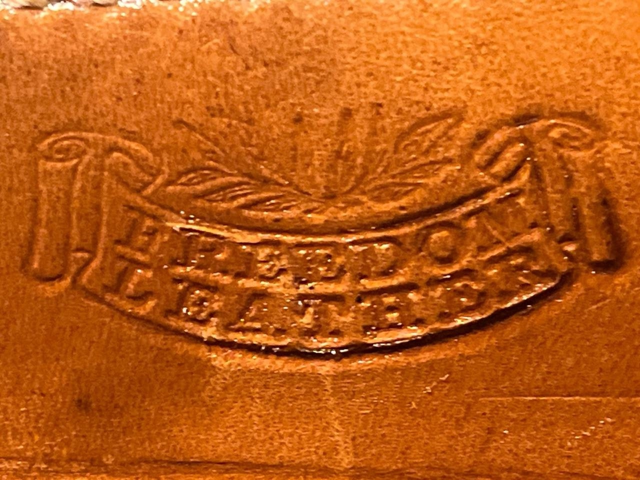massives, schweres Holster aus 2-lagigem hellbraunen Sattelleder, Rechtshand, geschlossen am Lauf, und wie hier auf eine Nahaufnahme