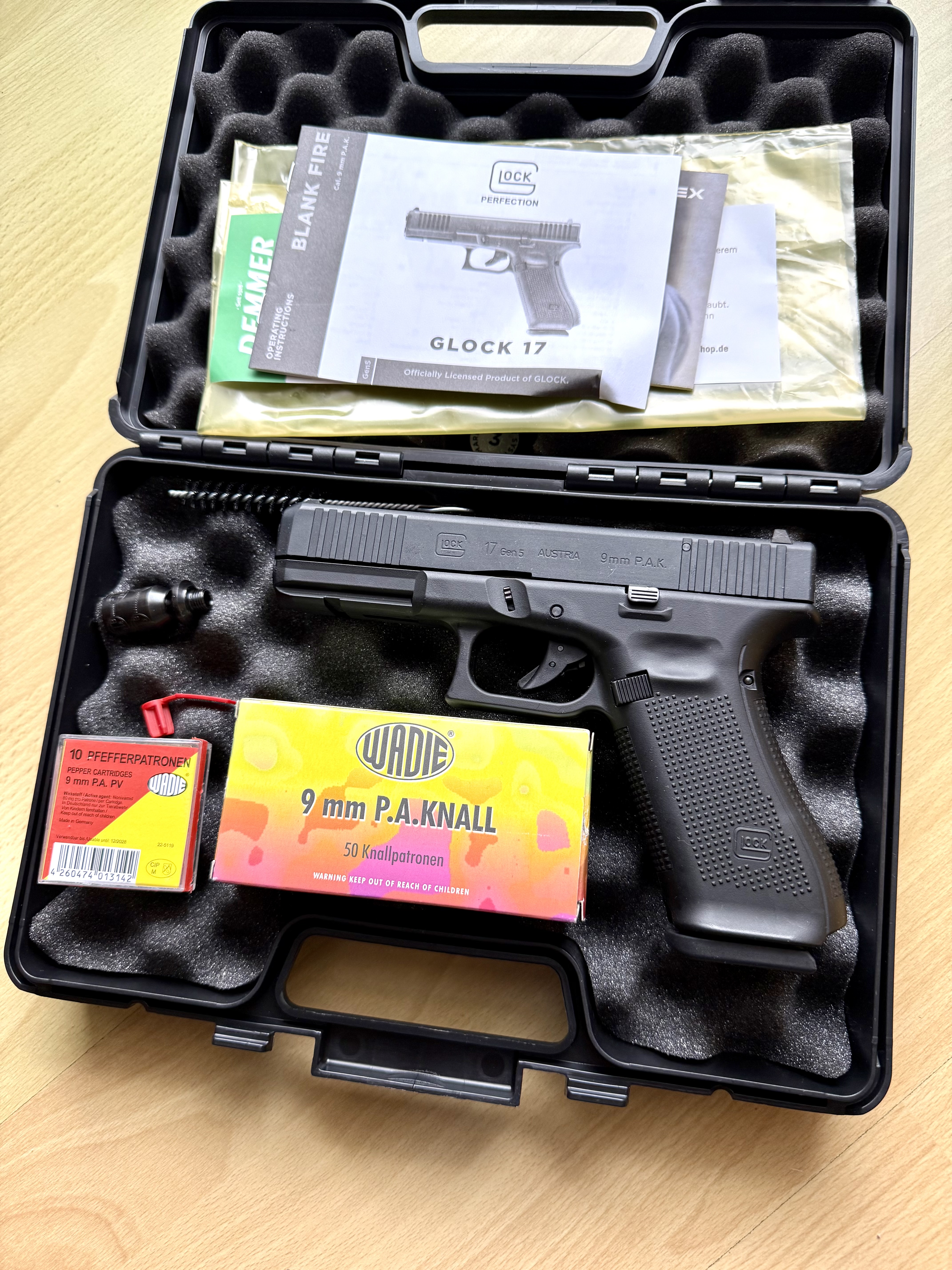 Biete eine neue unbenutzte Glock 17. Gen. 5 als Gas- u. Schreckschusswaffe an. Mit dabei sind 50 9mm Knallpatronen sowie 10 Pfefferpatronen