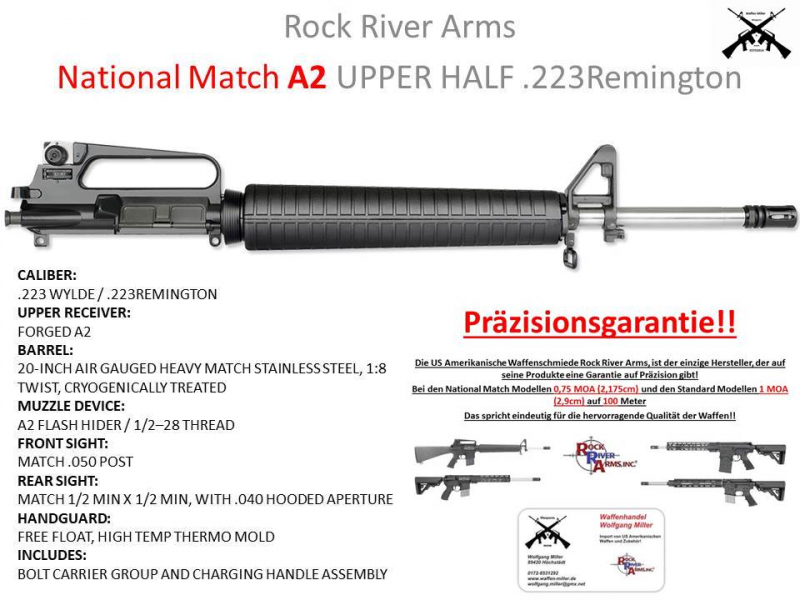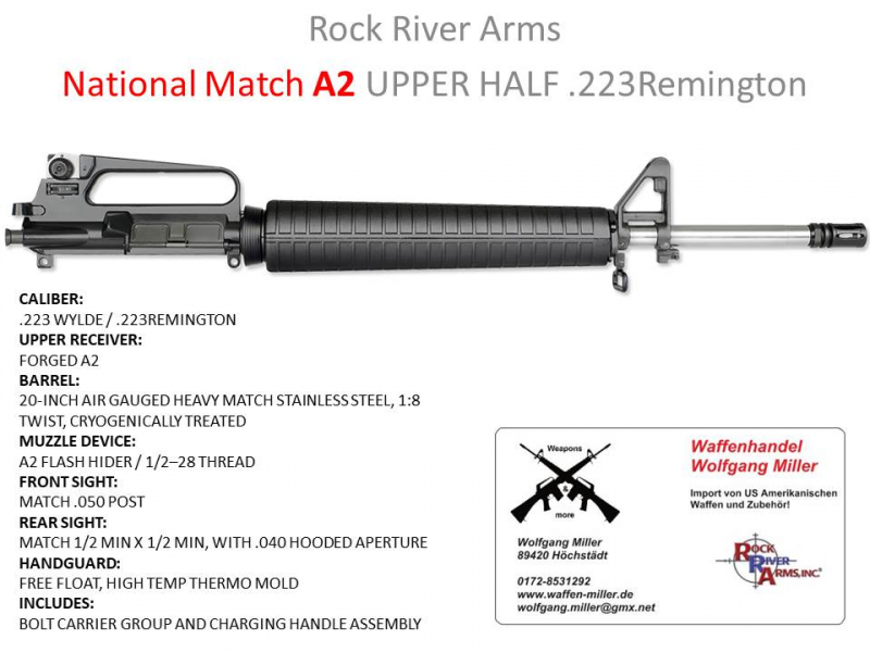 Biete einen Upper (Wechselsystem) des US Top Herstellers Rock River Arms. Modell National Match A2. Die Waffe vefügt über einen freischwingenden Stainless Lauf! Bei diesen Modellen nur von RRA zu bekommen! CALIBER:.223Rem. UPPER RECEIVER:FORGED A4 BARREL:20-INCH AIR GAUGED HEAVY MATCH STAINLESS STEEL, 1:8 TWIST, CRYOGENICALLY TREATED MUZZLE DEVICE:A2 FLASH HIDER / 1/2–28 THREAD FRONT SIGHT:A2 FRONT SIGHT BASE WITH MATCH .050 POST HANDGUARD:FREE FLOAT, HIGH TEMP THERMO MOLD INCLUDES:BOLT CARRIER GROUP AND CHARGING HANDLE ASSEMBLY www.waffen-miller.de Wechselsysteme sind ohne Voreintrag zu erwerben, es muss lediglich die Grundwaffe eingetragen sein. Der Upper ist mit allen AR15 Systemen kombinierbar auch für HK MR223 A3 Bitte nehmen Sie Kontakt zu mir auf.