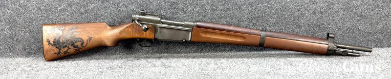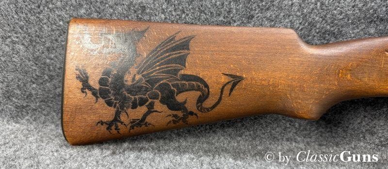Die insgesamt hervorragend erhaltene und nummerngleiche Waffe verfügt über einen 570 mm langen Lauf, mit erstklassigem Zug-/ Feldprofil. Zur Bedeutung des auf dem Hinterschaft aufgemalten Drachens können wir leider keine Auskunft geben. Die Konvertierung zum Einzellader wurde durch Einschweißen einer Lademulde umgesetzt.