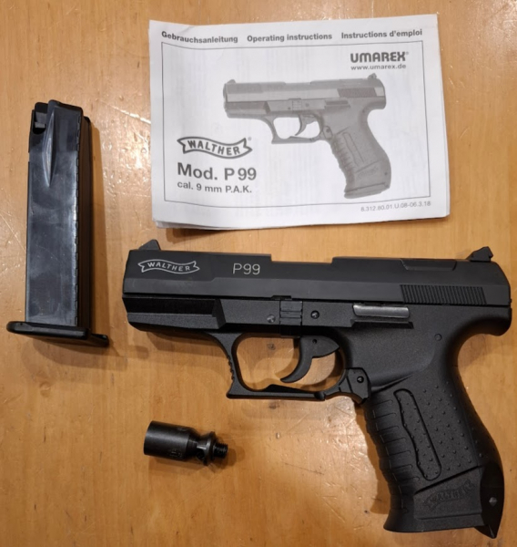 Walther, P99, 9 mm P.A.K., 9mm PAK, PTB 762, Schreckschuss, SSW, Gas-Signal, Blank Gun, Made in Germany, Umarex, Magazin, Abschussbecher, Anleitung, Silvester, Kleiner Waffenschein, Sammler, PAK, Platzpatronen.