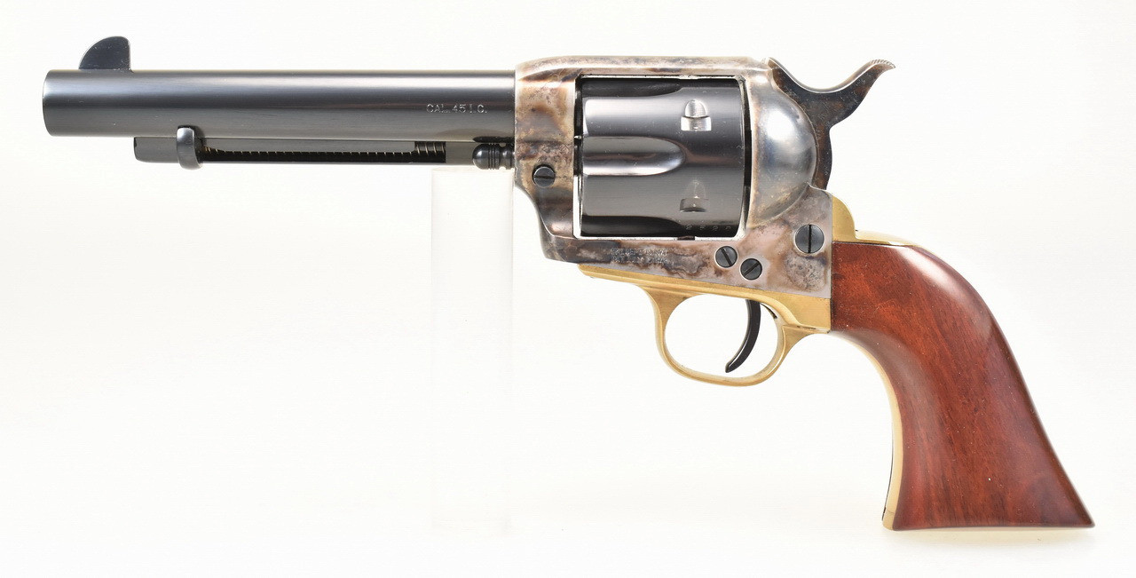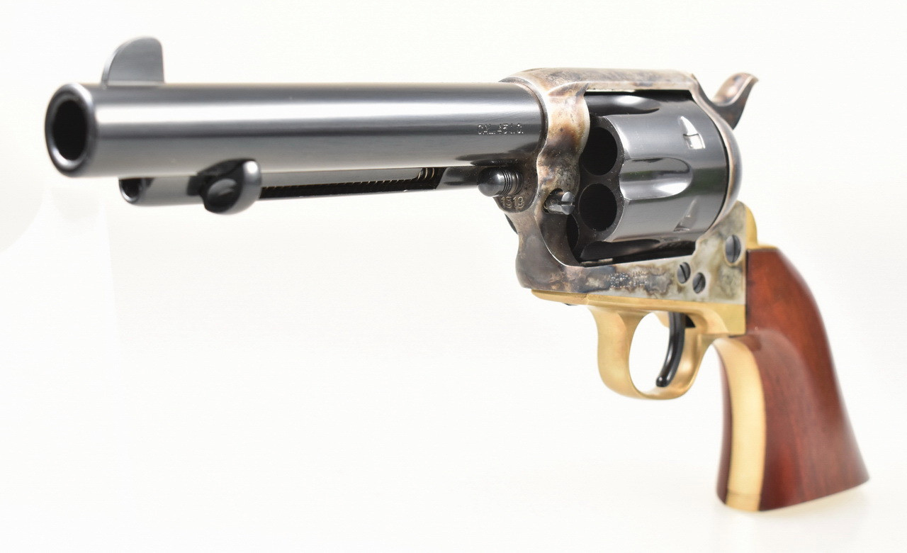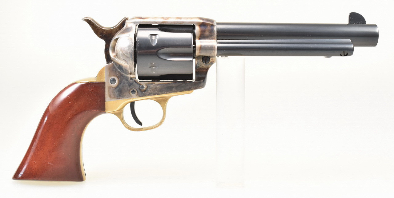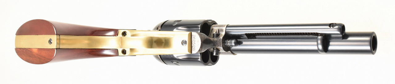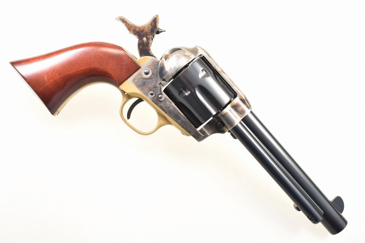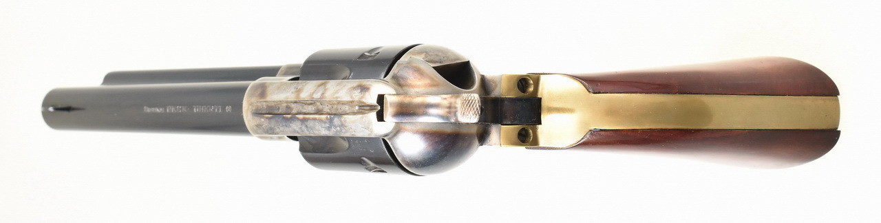 Brünierter Single - Action Ganzstahl Revolver im " Colt 1873 SAA Stil " aus italienischer Produktion der Aldo Uberti S.r.l. Modell Cattleman. Spiegelblanker Lauf. Beschuß 2005. Rahmen und Hammer und buntgehärtet. Griffrücken und Abzugsbügel in Messing - Ausführung. Glatte Nußbaum - Holzgriffschalen. Leichte Gebrauchsspuren sind vorhanden. Details siehe Bilder.