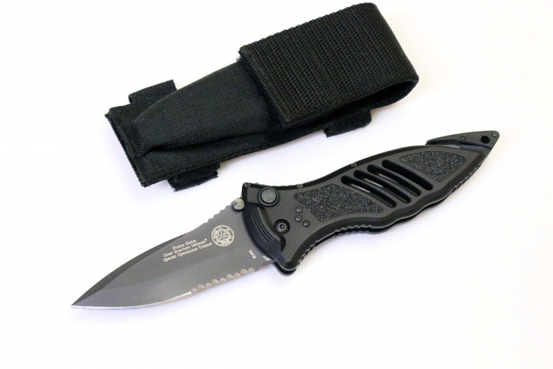 Beschichtete Drop-Point Klinge mit partiellem Wellenschliff. Der Klingenrücken mit Daumenauflage. Die Klinge quartseitig bezeichnet "Duane Dieter" über "Close Quarters Defence", über "Special Operations Trainer", neben dem Firmenlogo "MASTERS OF DEFENCE". Die Klinge aus "154 CM" Edelstahl.