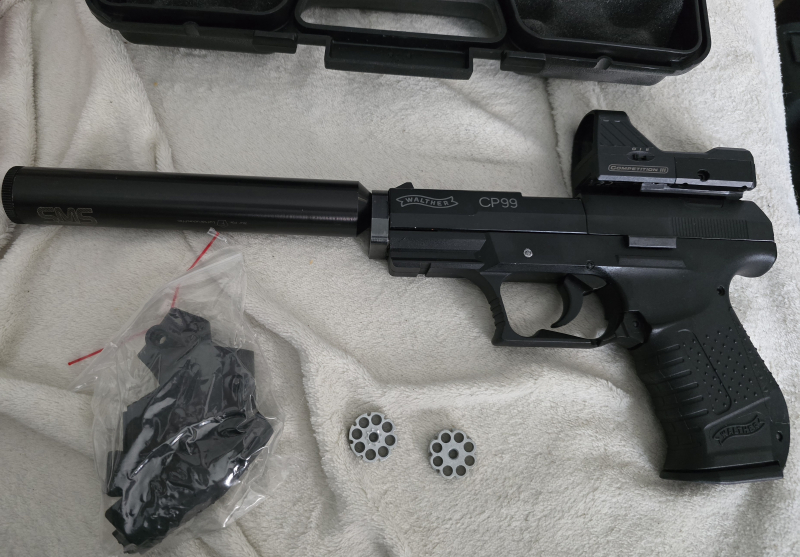 Hallo, biete hier eine Walther CP99, CO2. 4,5mm Diabolo mit Schalldämpfer und Red Dot. Die waffe ist in einem sehr guten zustand, minimale gebrauchspuren. Wurde selten geschossen. Mit dabei ein koffer, Schalldämpfer plus gewindeaufnahme, red dot plus Montage, 2 laderinge und wechselrücken griffe. Waffe hat kein Blowback und ist aus Metall und Kunstoff. Waffe wurde sehr gepflegt.