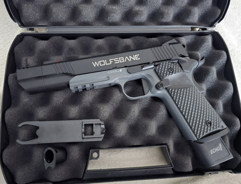 Hallo, biete hier eine Echo1 Wolfsbane 1911. 6mm BB, Gas, Grau/Schwarz. Die waffe ist in einem neuwertigen zustand, keinerlei gebrauchspuren. Wurde nicht geschossen. Mit dabei ein koffer, anleitung und kompensator. Waffe hat Blowback und ist aus Metall und Kunststoff. Waffe wurde sehr gepflegt.