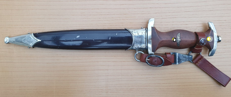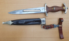 Verkaufe XA Dienstdolch M33 mittlere Fertigungsperiode. Gereinigte Klinge des Herstellers E. & F. Hörster Solingen, ca 6000 Klingen hergestellt , brauner Holzgriff mit original eingestzten Emblemen , Neusilber Beschläge , braun Lackierte Scheide mit nahezu 100% des original Lackes und braunen Gehänge. Die Scheidenbeschläge sind aus vernickeltem Eisen , der obere hat eine kleine Lötstelle aus Silberlot. Getragagen , Zustand 2