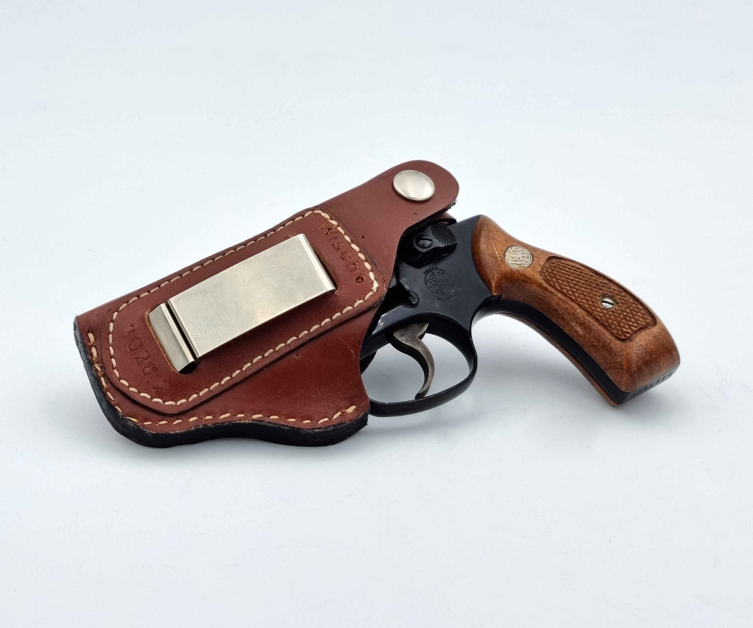 Smith & Wesson Model 37 Airweight, Kal. .38 Special, 2" Lauf, 5-Schuss-Zylinder, leichter Aluminiumrahmen mit Stahlzylinder, feste Visierung, klassische J-Frame-Ergonomie — inkl. passendem Lederholster. Ideal für Sammler und als Concealed-Carry-Option.