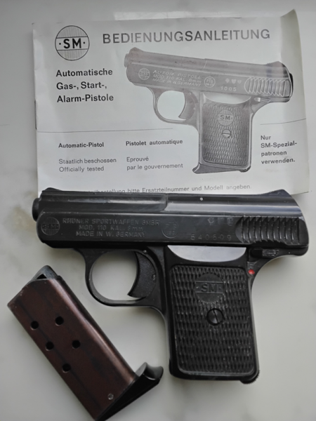 SM Taschenpistole – Signalpistole - Gaspistole – Alarmpistole. Hersteller: Fabrikat Rhöner Sportwaffen GmbH. Modell 110. Kaliber 8 mm. Mit PTB – Zeichen 153. Waffennummer 6 stellig: 540xxx. Made in Germany. 6 – schüssig ?. Mit 1 Magazin. Brünierte Ausführung. Mit Kunststoff – Griffschalen. Mit Sicherung. Mechanische Funktionen sind in Ordnung. Waffe lässt sich spannen und abschlagen. Mit Original Bedienungsanleitung.