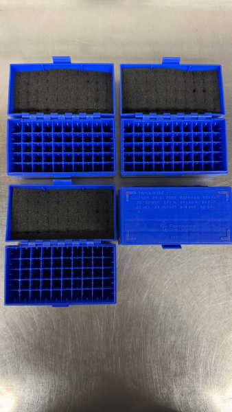 Verkauft werden hier offensichtlich nirgendwo mehr erhältliche 4 Stück Patronenboxen aus den USA. Hersteller Flambeau, aus dem Nachlass eines Kollegen. Die Dosen sind gebraucht und eignen sich für die folgenden Kaliber: