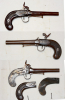 Perkussions-Reisepistole mit Plattenschloss, Lauflänge 12,3 cm, Gesamtlänge 23,8cm, Kaliber 13mm, keine Herstellerangabe, italienisch oder französisch, rechte Griffschale mit geklebtem Riss, Piston repariert, guter technischer Zustand, altersbedingter Allgemeinzustand ohne Mängel