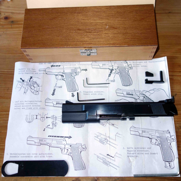Biete Original Peters Stahl Wechselsystem im Kaliber .22lfB / lr mit einer Lauflänge von 5" für Modell 1911 incl. Magazin und diversem Zubehör (siehe Bilder) in Holzschatulle zum Verkauf. Das System befindet sich in einwandfreiem Zustand, der Lauf ist spiegelplank, Zug- Feldprofil scharfkantik. Verkauf nur an erwerbsberechtigte Person gegen Vorlage einer gültigen WBK mir Voreintrag (beglaubigte Kopie), Garantie und Rüchnahme ausgeschlossen. Der Artikel kann natürlich gerne auch abgeholt und bar bezahlt werden.