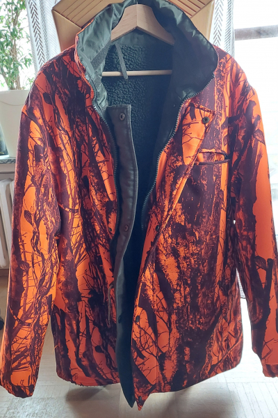 Biete eine gebrauchte, gut erhaltene Drückjagd Wendejacke, mit Membran. Die Jacke hat viele Taschen und ist schön warm. Einziger bekannter Mangel ist die Aufhängelasche. Wer einen Kleiderbügel zum Aufhängen nutzt, hat das Problem gelöst.