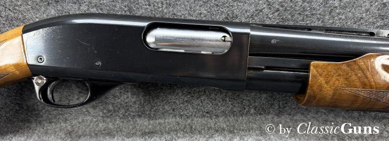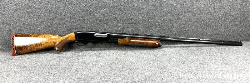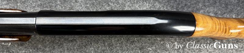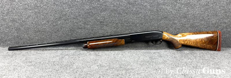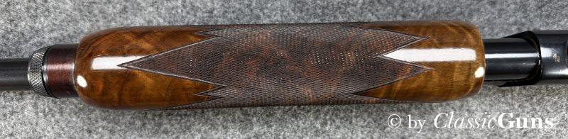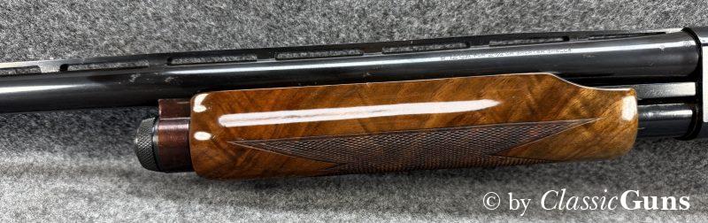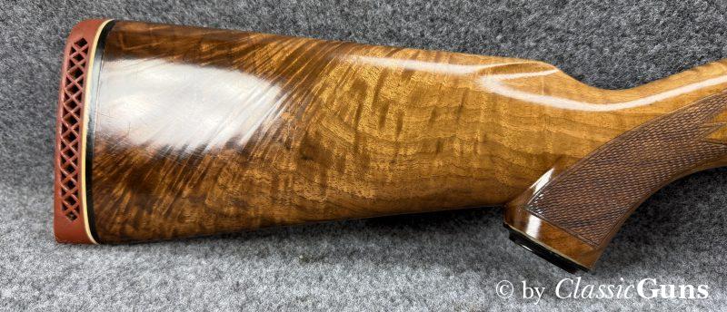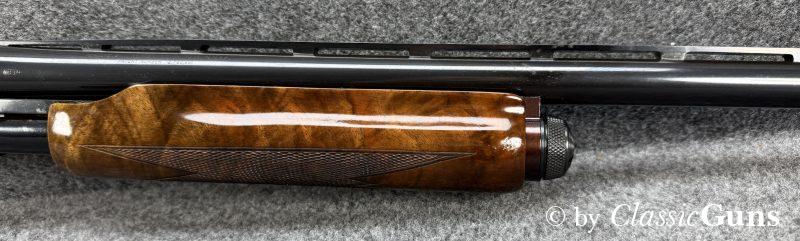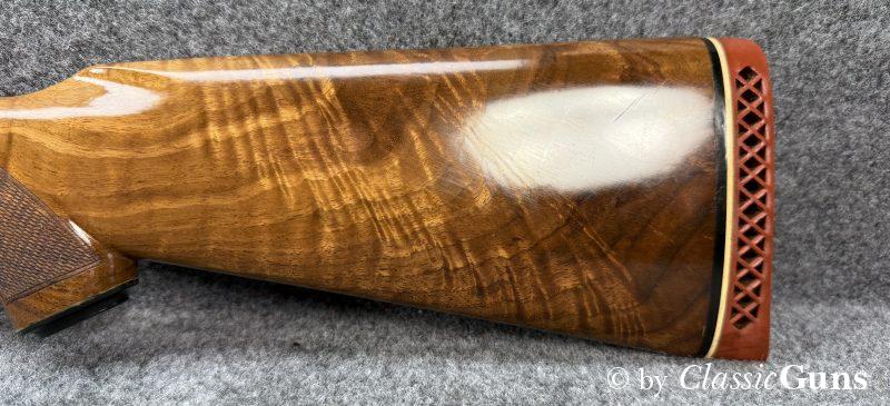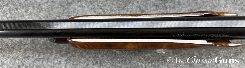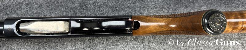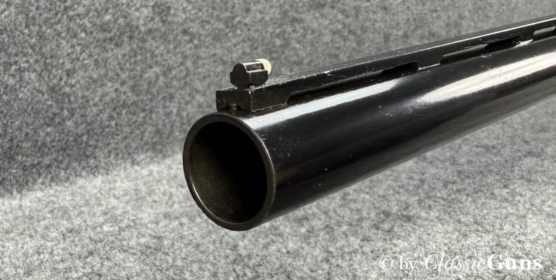 750 mm langer Lauf mit Vollchoke und Laufschiene mit Hilfskorn, innen spiegelblank. Systemkasten aus Stahl, doppelte Repetierstangen. Sehr gut erhaltene Brünierung, mit nur leichten Gebrauchsspuren. Sehr schöner Schaft aus gut gemasertem Nussbaum. Röhrenmagazin für drei Patronen.