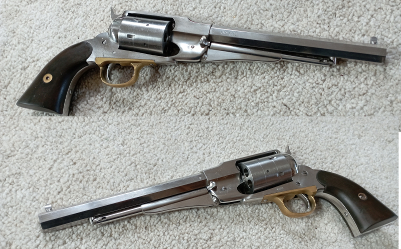 Zum Verkauf kommt ein sehr seltener Edelstahl Remington mit der PTB 304 in 9mmRK. Das war mit 598DM der mit Abstand teuerste freie Revolver von Neumann - zum Vergleich: Ein etwas häufiger anzutreffender Spiller&Burr kostete "nur" 449 DM. Die Waffe wurde aus einer originalen Waffe konvertiert. Felder und Züge sind noch im Lauf zu sehen. Der Lauf ist, abgesehen von einer kleinen Sperre an der Laufwurzel, komplett offen. Augenscheinlich ist er ungeschossen. Da aber das Edelstahl sich nach jeder Nutzung leicht abwaschen lässt, kann ich mich auch irren. Rückstände vom Gebrauch sind keine zu sehen. Der Zustand ist abgesehen von ein paar Dellen im Griff sehr gut. Er hat keine wilden Tragespuren o.ä. Das Korn ist auch noch dran (das fehlt bei vielen Remingtons, da es durch das ständige Holstern irgendwann abfällt). Die Trommel hat vom Trommelstopp zwei Kratzer, die kann man aber wegpolieren. Hat mich nie gestört. Für alle, die was schickes suchen, was schon von weitem im Holster glänzt, ist das hier was. Der Remington ist quasi wartungsfrei, und man kann mit ihm ohne Sorgen auch Schwarzpulver verschießen. Die Schlagnase ist in einem top Zustand. Auf dem freien Revolvermarkt gibt es ja aus Edelstahl nur den Erma EGR66x, Steel Scorpion (beides Taschenrevolver), den Steel Cop und eben diesen Remington. Während erst genannte Exemplare eigentlich schon Massenware sind (und ihr kennt deren Preiskategorie), ist der hier ein echter Exot, und anders als die zugenagelten Modelle von heute, hat dieser einen Lauf, wo man wirklich durchgucken kann. Für Leute, die was Exquisites haben wollen. Bei den Griffen bietet es sich an, mal welche aus Elforyn/Elfenbeinersatz anzufertigen. Leider hatte ich nie die Zeit dazu. Privatverkauf, keine Garantie. Fragen werden immer gerne beantwortet.