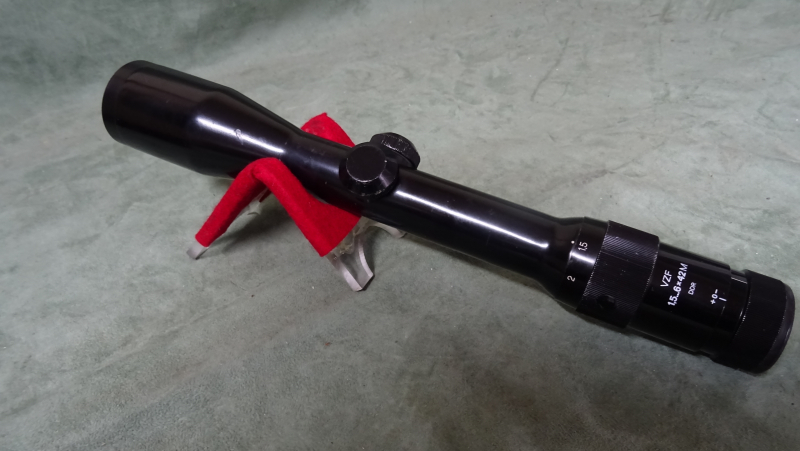 Gebrauchtes Zielfernrohr von Carl Zeiss Jena,1,5-6x42-M, mit Absehen 1. Made in DDR. Aluminiumkörper mit 30 mm Mittelrohrdurchmesser. Länge ca.32,5 cm.Linsen sind ohne Kratzer oder Putzschlieren, kein Belag oder Pilze. Mechanik ist gängig. Absehen ist zentriert, mit Höhen und Seitenverstellung. Außendurchmesser Objektiv sind 48mm.