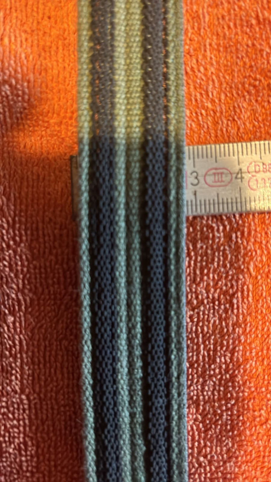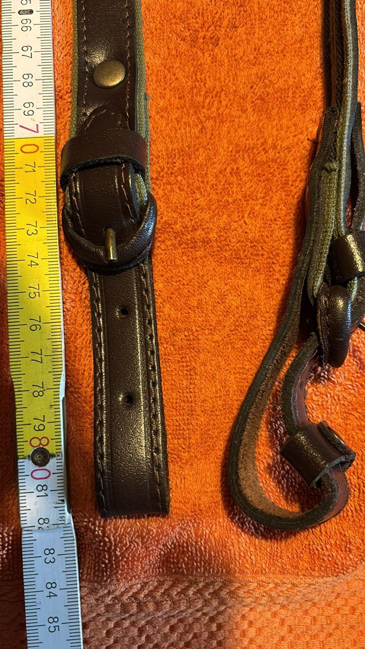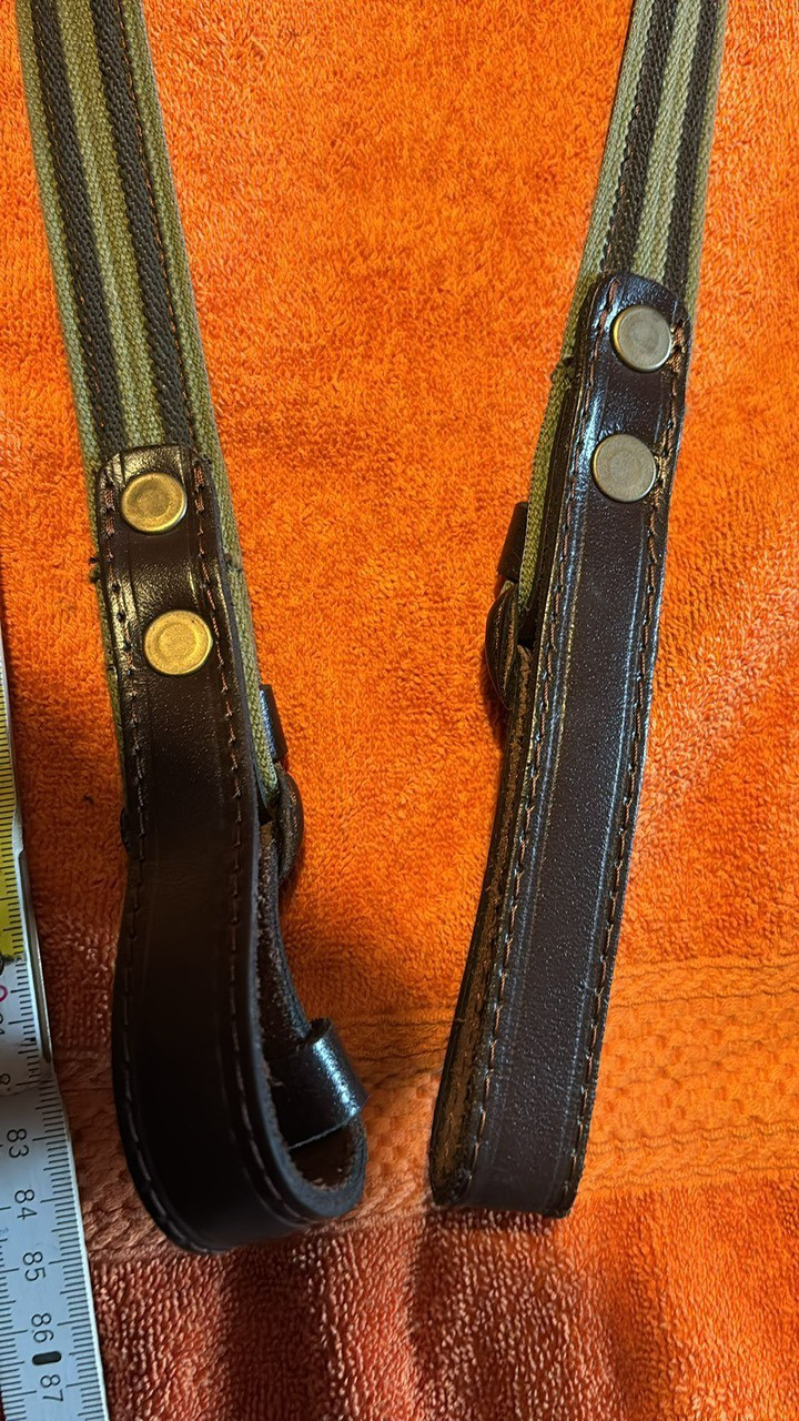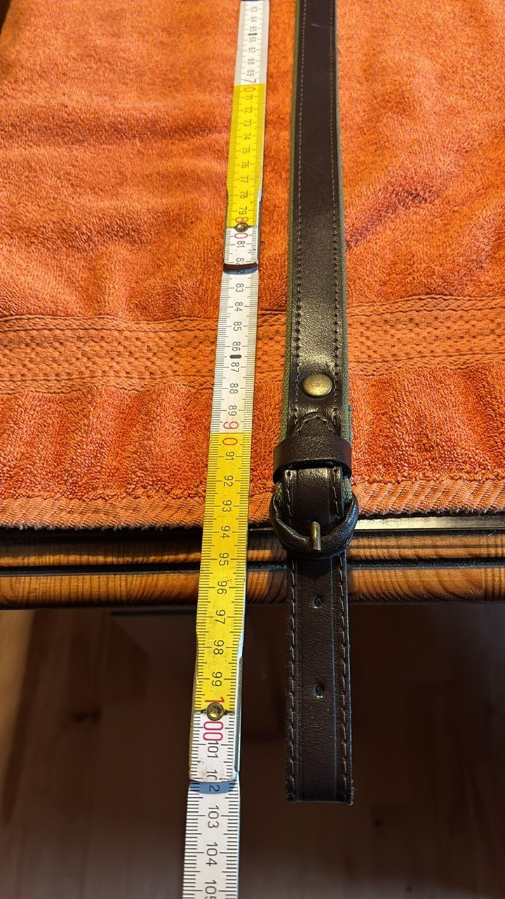 Dieser Riemen scheint noch nicht benutzt zu sein. Er wurde aus Leder und einem Stoffgemisch gearbeitet.