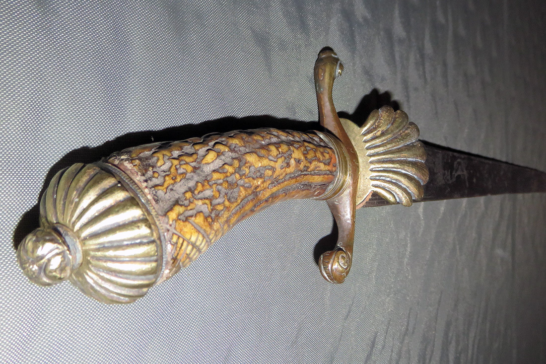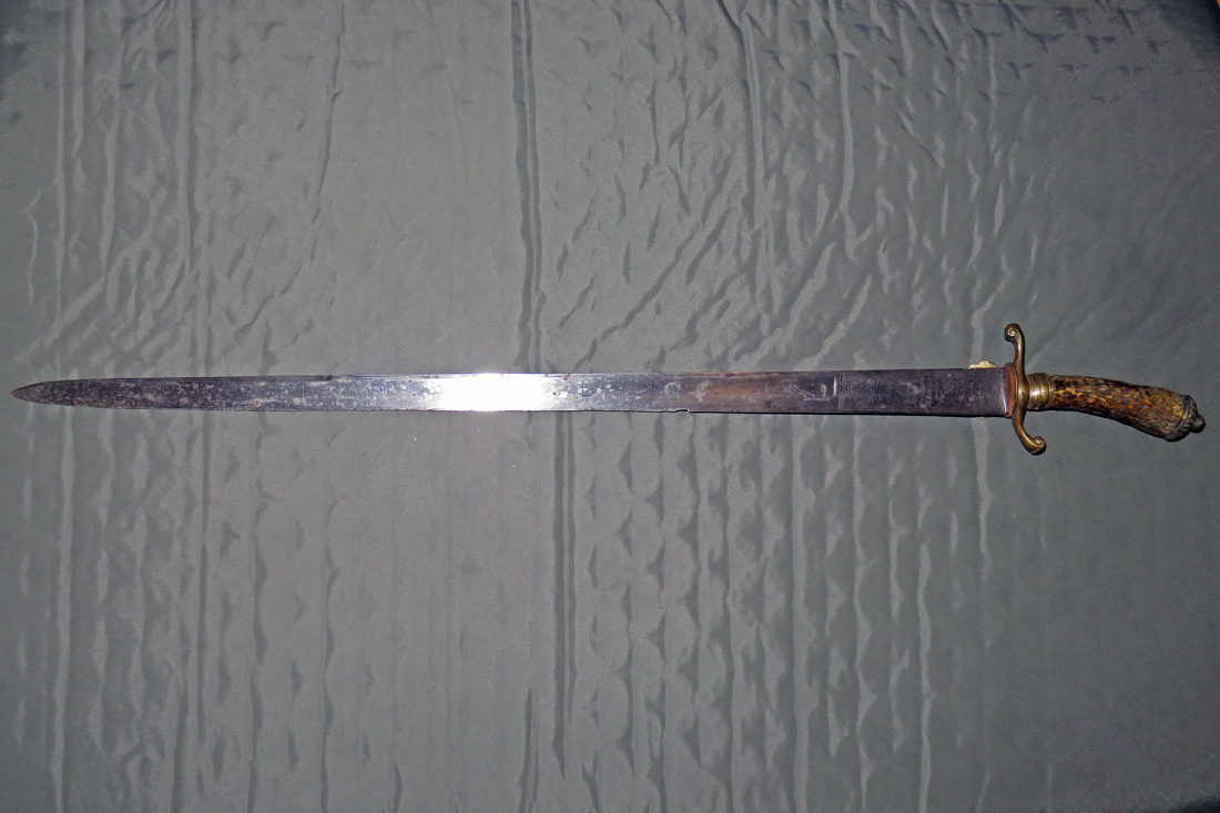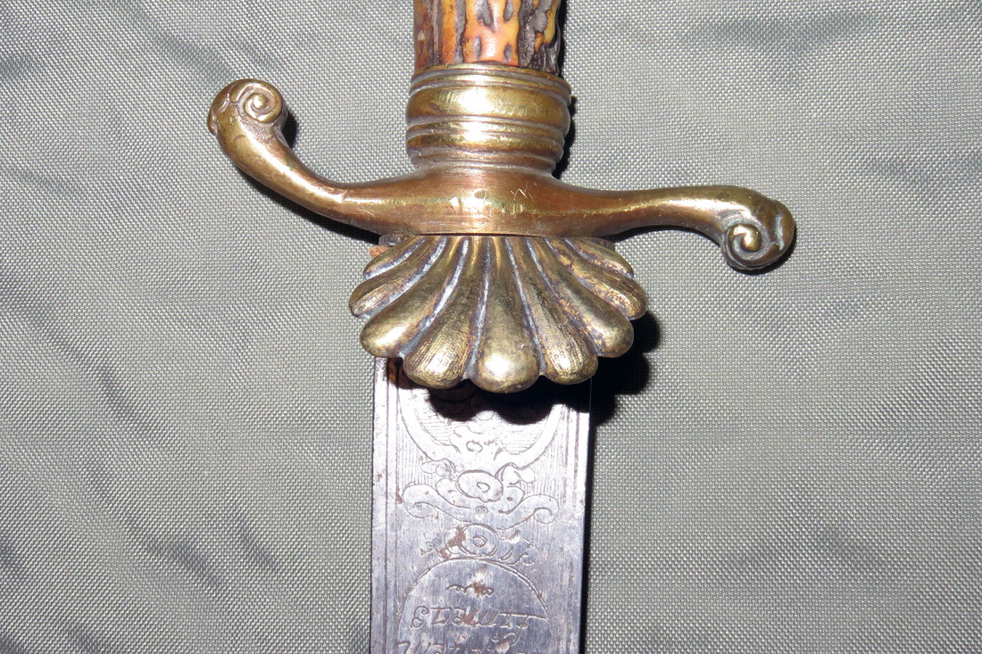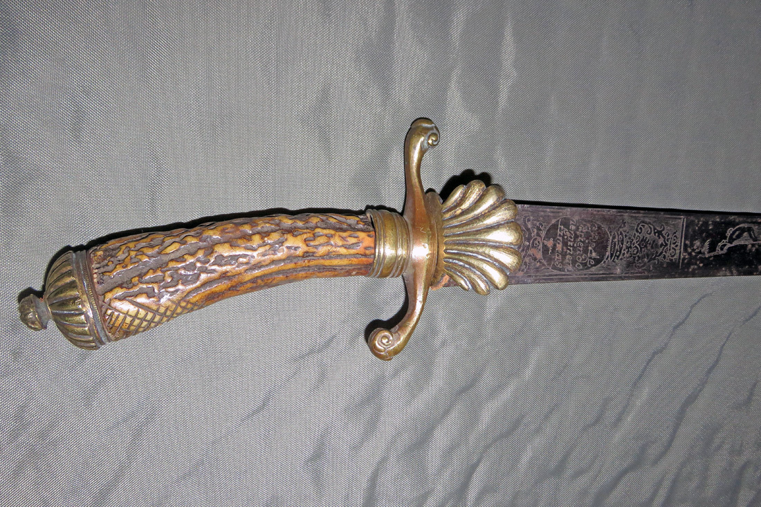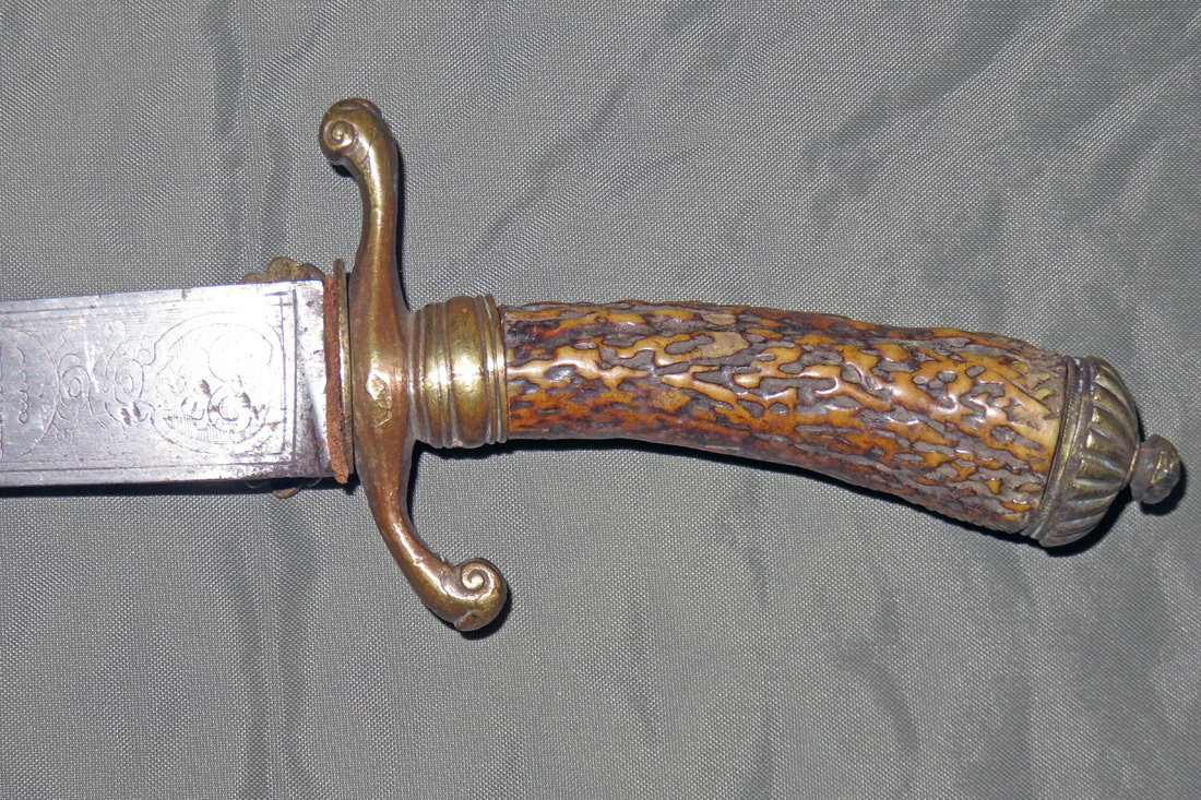 Alter Hirschfänger mit einem Hirschhorngriff und Messingbeschläge.