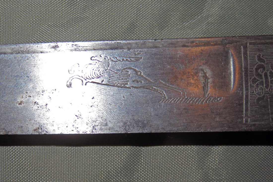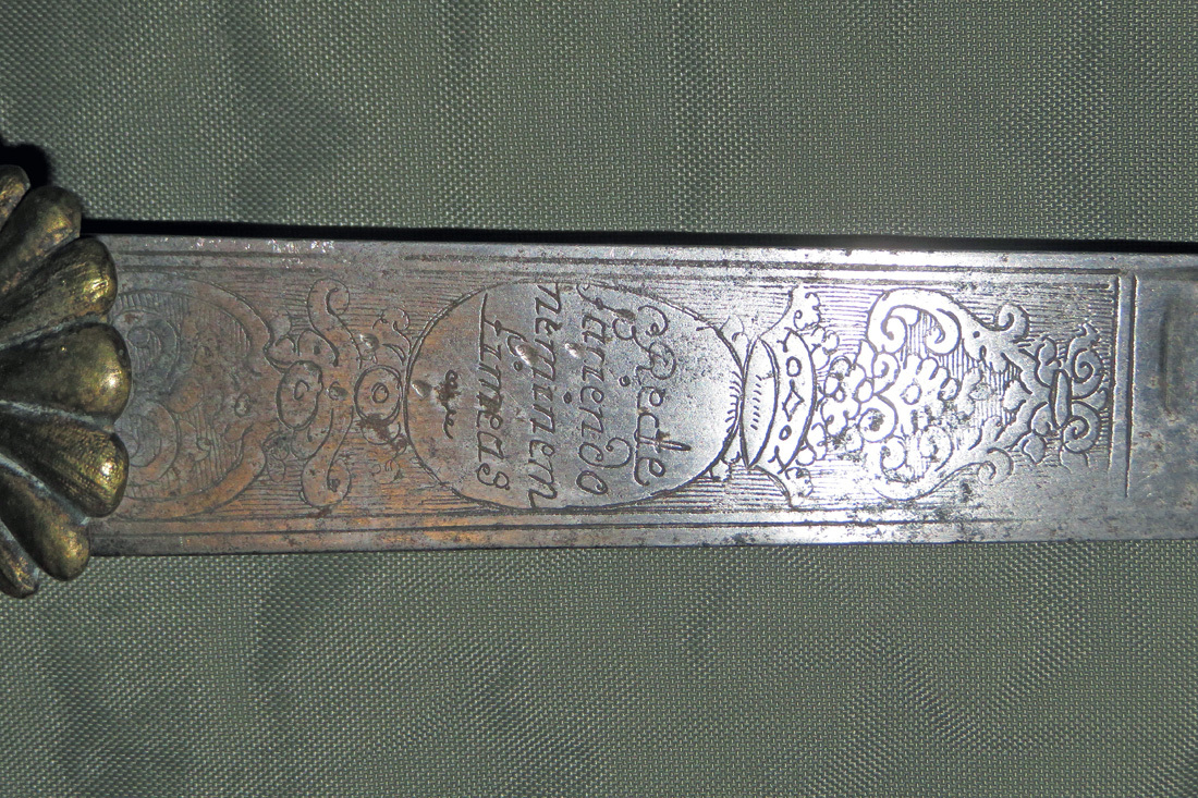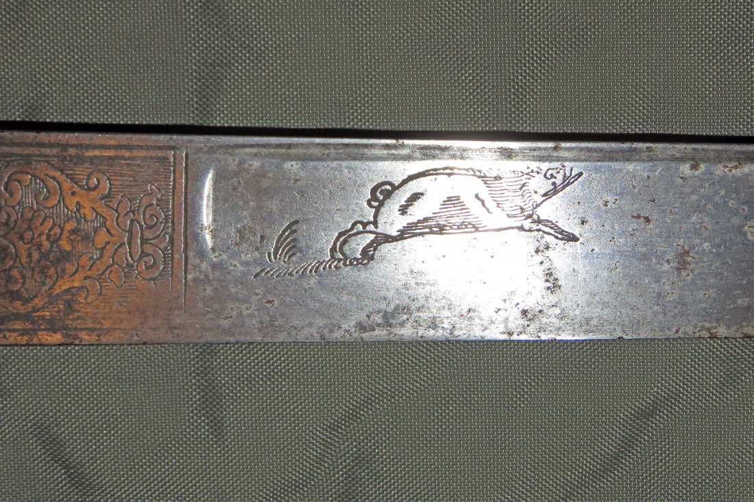 Die Klinge ist beidseitig geätzt mit Jagdmotiv, Ornamentik, Krone und Spruch im Oval.