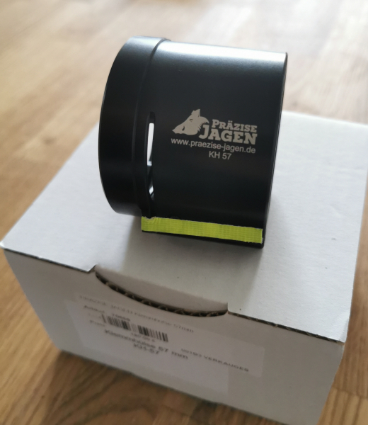 Zur Auktion steht eine neuwertige PRÄZISE JAGEN Klemmhülse 57mm, die Klemmhülse wurde vor 6 Monaten gekauft, Rechnung für Garantie vorhanden. Verkaufe weil ich mir ein neues Zielfernrohr gekauft habe, das leider einen andren Durchmesser hat. Sie wird über eine Länge von 45 mm über das Objektiv des Zielfernrohres geschoben und dort verschraubt. Sie verbleibt dauerhaft auf dem Zielfernrohr. Auf den Anlageflächen der Klemmhülse zum Objektiv des Zielfernrohres ist eine Schutzfolie aufgezogen die eine Beschädigung des Zielfernrohres verhindert und die Haftung am Zielfernrohr erhöht. Dadurch wird die Klemmhülse und damit auch das Vorsatzgerät selbst bei starken Kalibern nicht vom Zielfernrohr abgezogen. Durch eine spezielle Innenkontur (Dreipunktauflage am Zielfernrohr) wird eine genaue Ausrichtung des Vorsatzgerätes zum Zielfernrohr erreicht. Das Bajonett an der Stirnseite der Klemmhülse ist die Basis für eine absolut wiederholgenaue Ausrichtung eines Vorsatzgerätes bei jedem erneuten Aufsetzen. Diese Klemmhülse ist aus einem Stück hochwertigen Aluminium gefertigt und durch eine harte Eloxalschicht vor Korrosion und Verschleiß geschützt.