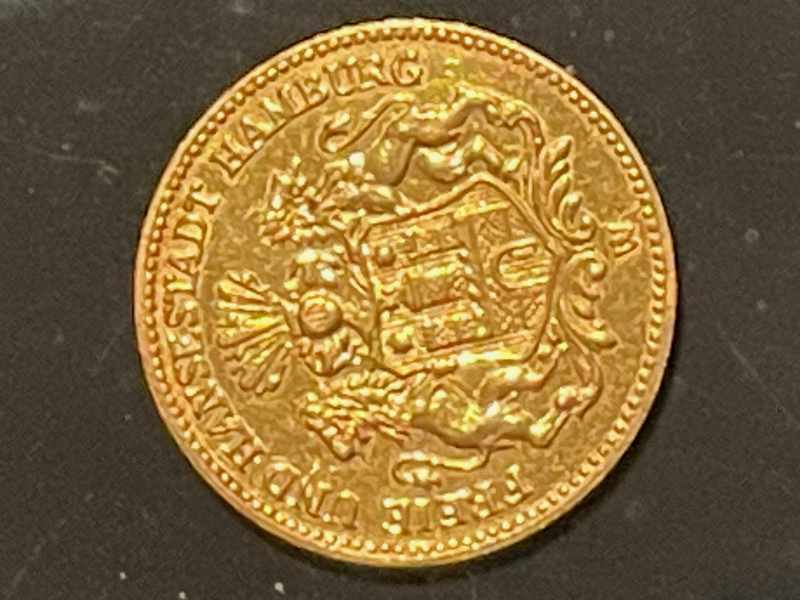 Goldmünze, 5 Reichsmark Hamburg von 1877.