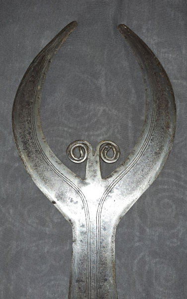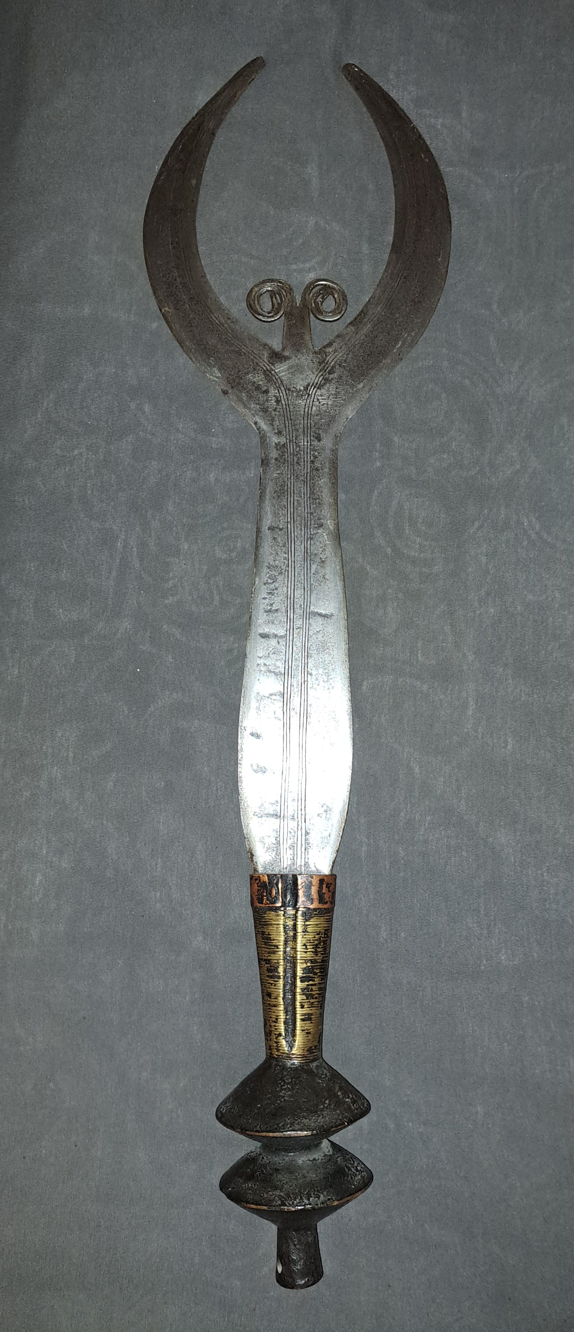 Verkaufe hier aus meiner Sammlung dieses Häuptlingsmesser EXECUTIONSSCHWERT– „Ngulu“ – Ngombe-, Ngala-, Mondjembo- oder Nkundu-Völker, D.R. Kongo. Dieses ist seit 40 Jahren in meinem Besitz. Es ist noch in dem von mir gekauften Zustand. Dieses Objekt ist 68 cm lang . Holzgriff mit Metallwicklung und beidseitigen Ritzdekor. Das Alter sollte um 1910 / 1920 herum liegen, also gute 100 Jahre alt. Privatverkauf. Bilder sind Teil der Beschreibung. Bitte bei Fragen zu diesem Stück einfach kontaktieren. Meine Beschreibung entspricht dem Wissen über dieses Objekt.