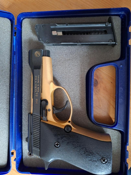 HW94 9mm aus limitierter Fertigung, begrenzt auf 2000 Stück, mittlerweile sehr gesucht. Die Waffe wurde sehr wenig benutzt. mit den original Griffschalen, kein weiteres Zubehör. Die HW 94 weist geringe Gebrauchsspuren auf. Der kleine Koffer ist gratis dabei.