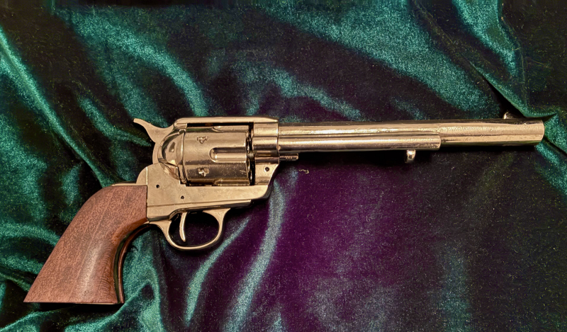 Originalgetreue Nachbildung des Colt .45 Peacemaker mit 5,5 Zoll Lauf und Holzgriffschalen. Simulierter Lade- und Schussmechanismus, vollbeweglich wie beim Original und kaum zu unterscheiden.