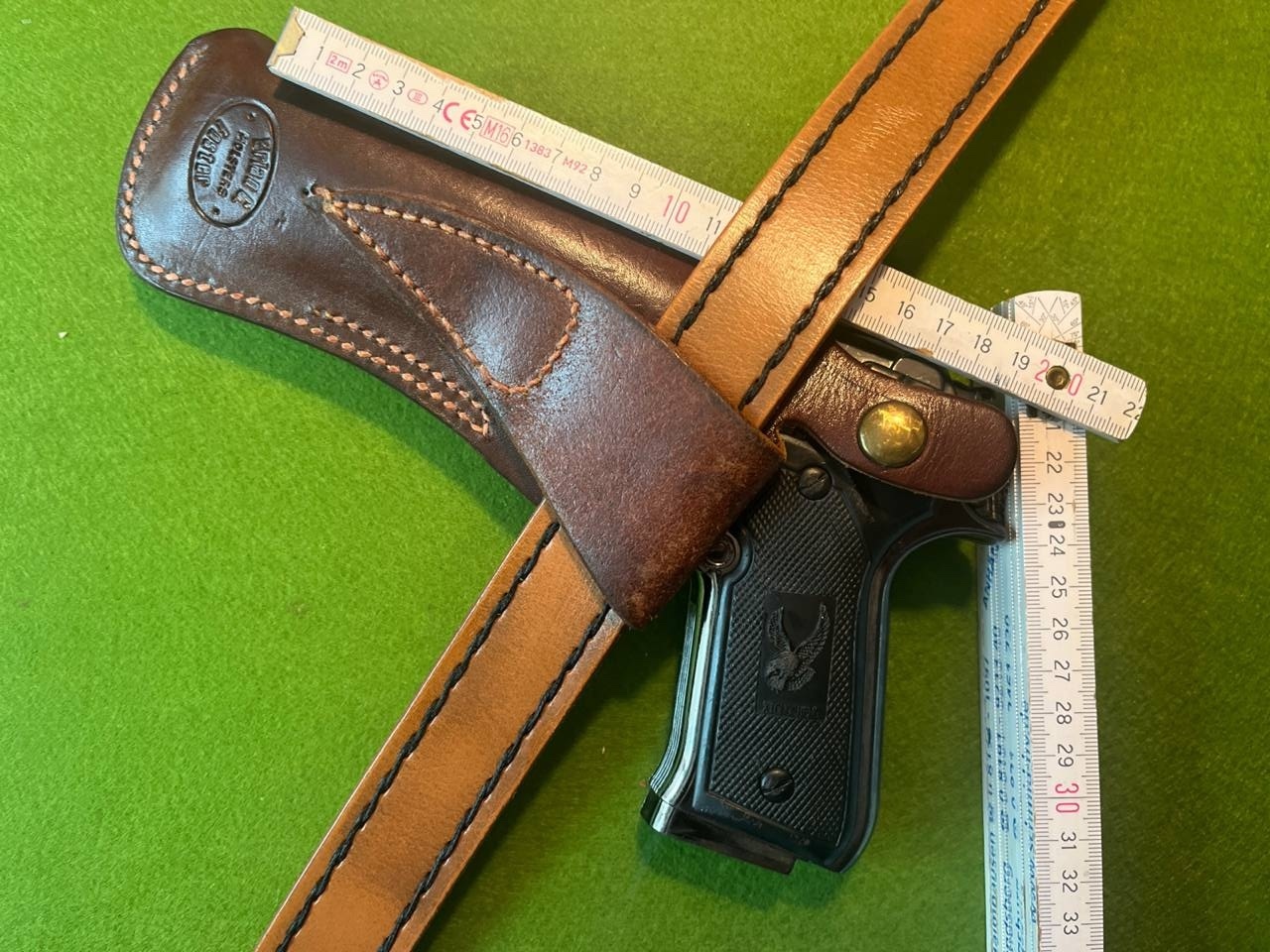 wofür eine kleine Anpassung ausreichen würde, ich nehme an, dass für kompakte Varianten das gleiche wie für die Berettas 80 gelten könnte. Rechtshand, geschlossen am Lauf, mit dem üblichen Druckknopfverschluss, die aus dem Holsterkörper ausgefaltete Gürtelschlaufe kommt auf gut brauchbare 55mm. Breite.
