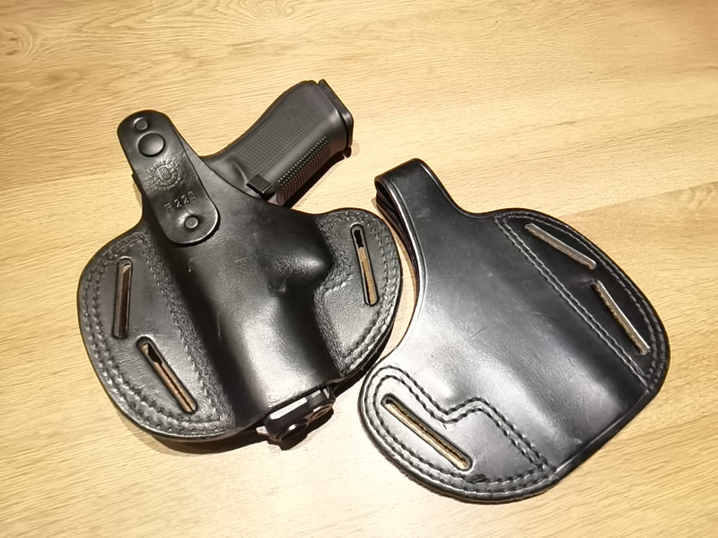 Pancake Holster aus Leder. Bekannter Hersteller: Höppner & Schumann. Geschmeidiger zu tragen als die starren Kunststoff- oder Kydex holster. Passt sich an verschiedene Waffen an. Ursprünglich für die Sig Sauer P225 vorgesehen, aber wie auf dem Bild zu sehen, passt unter anderem die Glock 17 genauso. Klassischer Thumbsnap Verschluss. Zwei verschiedene Tragewinkel können gewählt werden.