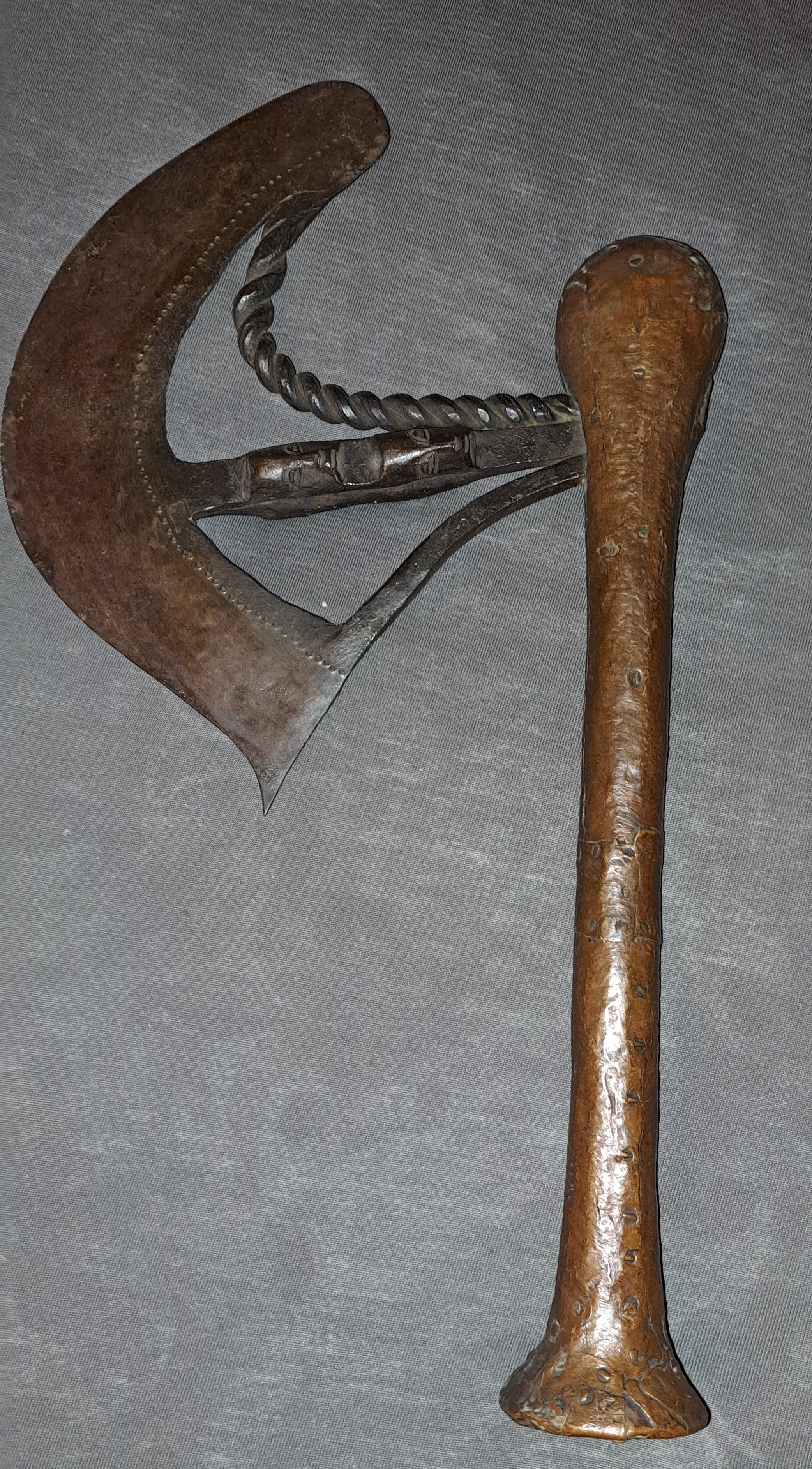Biete hier aus meiner Sammlung diese wunderschöne und ungereinigte NSAPO KILONDA Axt zum kauf an. Ca. 38cm . Mit Kupferblech umwickelter Holzschaft. Wundervolle verziert und bearbeitetes Blatt. Noch mit altem Waffenöl eingerieben. Wundervolle Patina. Ein wunderschöner Blickfang jeder Sammlung. Privatverkauf. Bitte bei Bedarf auch gerne Fragen stellen.