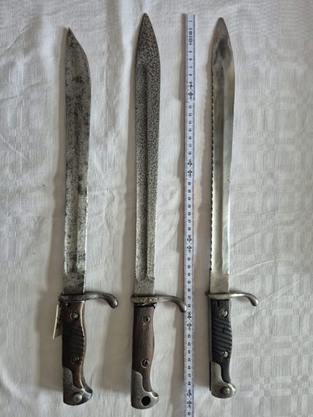Verkaufe 3 Bajonette ,glaube das es 98/05 sind,bin kein Sammler,stammt aus Erbschaft. Eins ist mit Sägerücken,da habe ich keine beschriftung gefunden, eins ist von der Waffenfabrik Mauser AG,da steht noch was drunter kann ich leider nicht entziffern, bei dem 3.steht drauf Zwillingswerke. Den Zustand entnehmen sie bitte den Bildern.