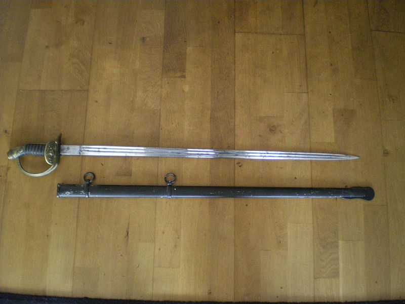 Der Degen befindet sich im guten gebrauchten Zustand. Kein Rost, keine Kerben, keine Dehlen. Der Griff befindet sich in einem seltenen schönen Ausführung.Es sieht so aus , dass nach dem Wunsch einem Offiziers ist der Rücken der Klinge und der Knauf sehr künstlich graviert. Klappscharnier. S. Fotos.