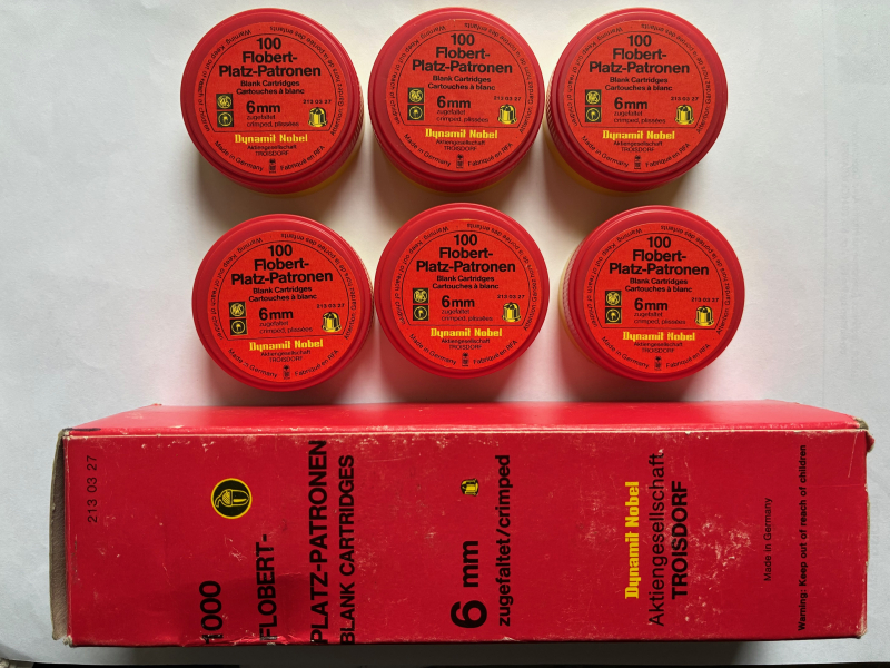 6 mm FLOBERT Platz-Patronen, Dynamit Nobel Aktiengesellschaft TROISDORF, zugefaltet, 600 St. (6 x 100), 213 03 27. Die Versandkosten in Höhe von 7,69 € (DHL Versand) oder 5,49 € (HERMES Versand) gelten nur innerhalb Deutschlands. Für andere Länder kommen höhere Versandkosten infrage – bitte vorab anfragen. Dies ist ein Privatverkauf - keine Rücknahme, Garantie oder Umtausch. Der Verkauf erfolgt unter Ausschluss jeglicher Sachmangelhaftung. Der Bieter erklärt sich mit der Gebotsabgabe damit einverstanden.