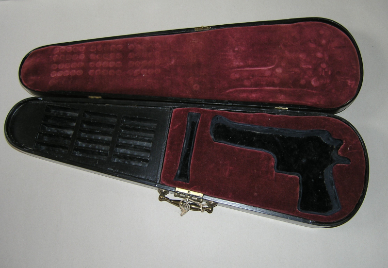 Originaler Geigenkasten, dunkelbraun-hochglanz-lackiert. Innen recht geschmackvolle Einlage für eine Desert Eagle. Den Hülsenboden-Abdrücken nach für Kaliber .44 oder .50. Schlüssel anbei, Schloss funktioniert.